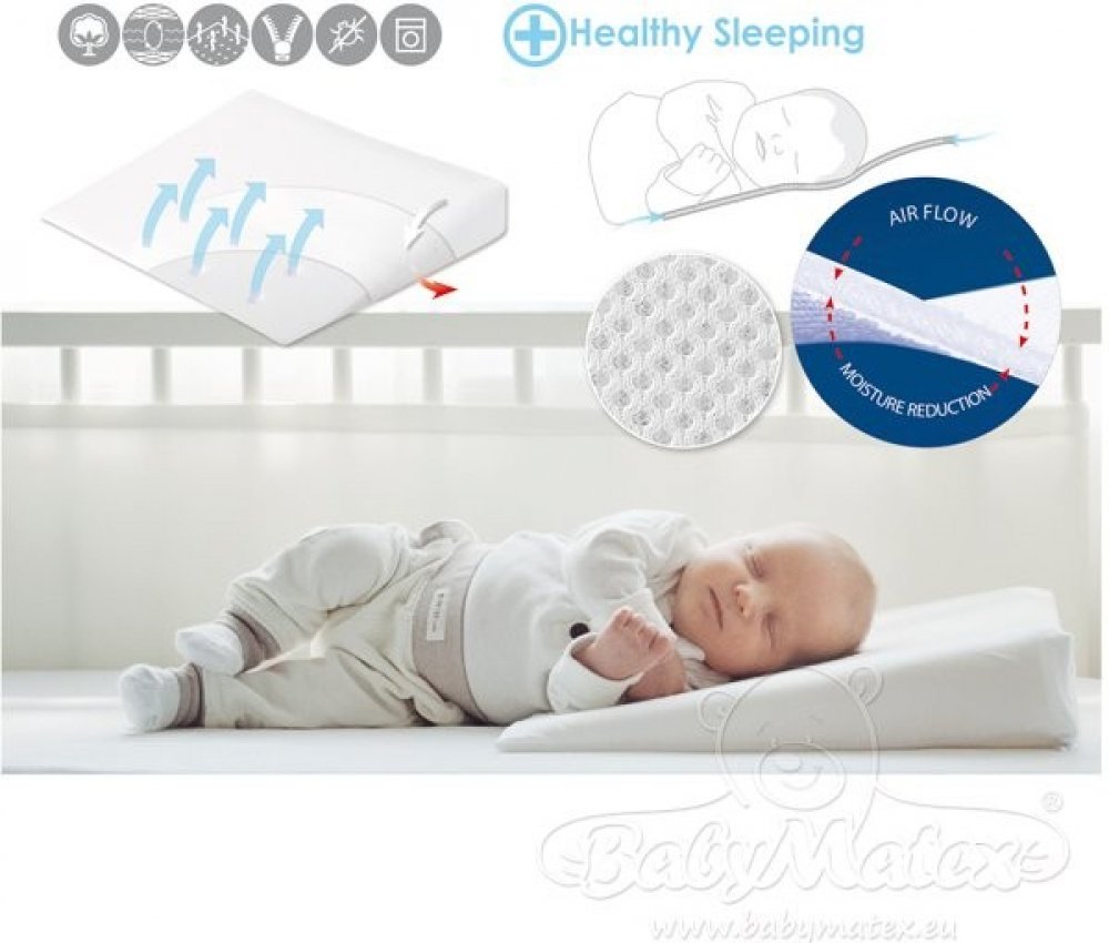 Klín do postýlky AEROKLIN o rozměru 40x36cm značky Babymatex s pratelným snímatelným potahem. Klín do postýlky se používá ke zvýšení polohy hlavičky miminka v postýlce, a to u miminek, které mají např. problémy s ublinkáváním - snížení rizika vdechnutí zvratků, u miminek s onemocněním horních cest dýchacích (např. rýma) - k usnadnění dýchání, a v mnoha dalších případech. Klín do postýlky má sklon cca 15°, je vyroben z polyuretanové pěny - ve které je umístěno několik ventilačních otvorů zlepšující cirkulaci vzduchu. Klín je opatřen snímatelným potahem, který je vyroben lze prát v pračce - lehce se tak udržuje v čistotě.Rozměr: 40x36 cm (šířka x délka).Materiálové složení: potah - 100% bavlna; klín - polyuretanová pěna. -