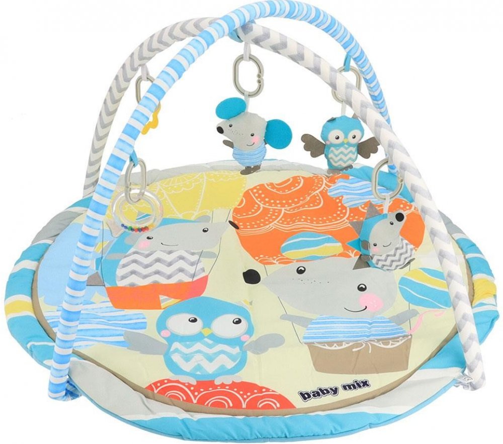 Krásna vzdělávací hrací deka s hrazdou Baby Mix, rozvíjí dětskou představivost díky poznávaní barev a tvarů. Měkká polstrovaná deka se svěžím designem. Díky jednoduché konstrukci a dodávané tašce lze deku lehce přenášet. Zavěšené hračky: chrastítka, pískací hračky. Hrazdičky se dají odepnout, stejně tak jako hračky. Příjemný a měkký materiál umožňuje pohodlné ležení na bříšku nebo zádech a umožňuj...