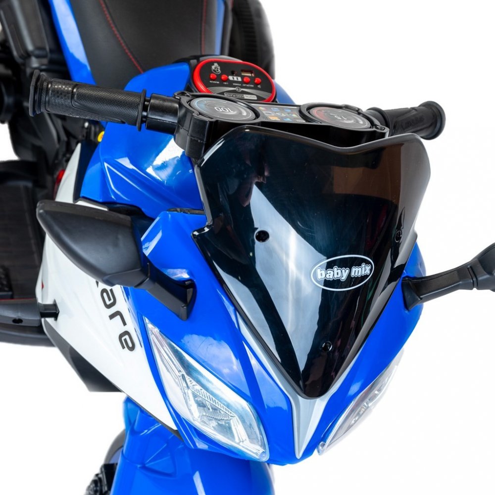 Dětská elektrická motorka Rare Baby Mix je vybavena baterií 6V7AH a dvěma motory s výkonem 380. Disponuje funkcí jednoduchého startu na jedno tlačítko, která umožňuje jízdu vpřed i vzad. Motorka je vybavena hudbou, písničkami pro děti, kartou pro čtení dat pro rané vzdělávání, třemi koly a LED světlomety. Komfort zajišťuje kožené sedadlo.