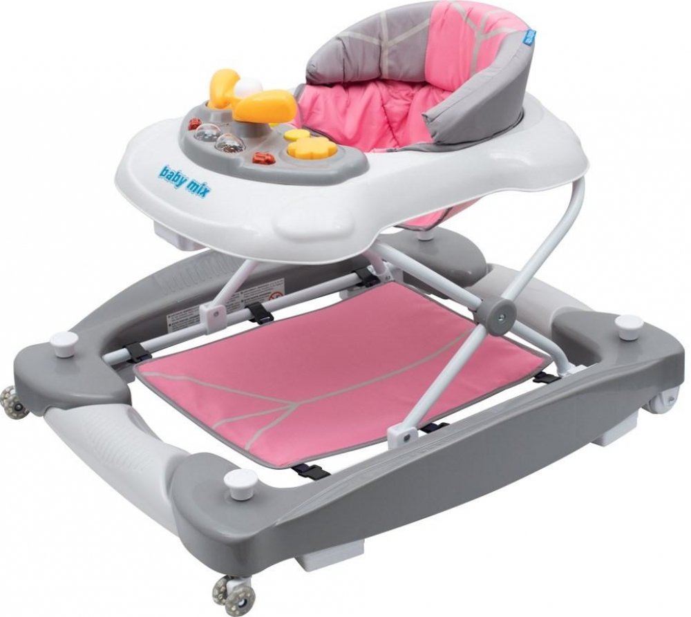 Dětské chodítko Baby Mix ve veselých barvách se čtyřmi silikonovými kolečky. Chodítko je nastavitelné do několika poloh a má velice pohodlný potah, který lze vyprat a je v zadní části vyztužený. Hrací pultík je vybaven volantem, který píská a lze ním otáčet, květinka, hrkálka, dvě tlačítka, které hrají melodie a dvě světýlka. Vyrobeno z kvalitního plastového materiálu. Rozměry cca 75x70 cm. Bateri...
