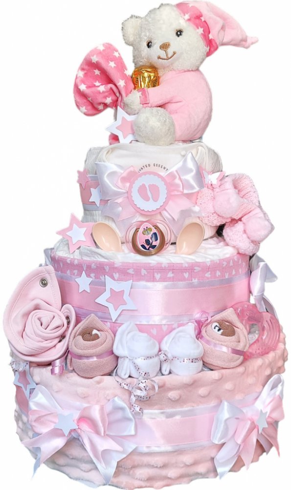 Jemný plenkový dort v růžových světlých odstínech je přímo stvořený pro novorozenou priceznu. Mevdíka s chrastítkem si miminko zamiluje a rodiče budou nadšení z kvalitní výbavy.
