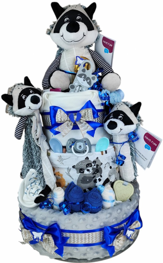 Tahle rošťácká parta mývalů si získá lásku každého miminka. Potěšte nastávající maminku a tatínka tímto opravdu bohatě vybaveným a zdobeným plenkovým dortem v moderním kontrastním designu, který je složen ze samých praktických a krásných miminkovských věciček, které novopečená maminka určitě ocení a překvapení uvnitř dortu určitě potěší.