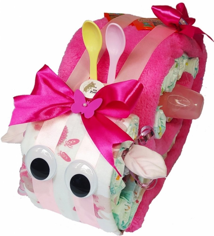 Potěšte nastávající maminku a tatínka tímto opravdu originálním plenkovým dortem ve tvaru šneka pro právě narozenou holčičku. S tímto plenkovým dortem určitě zazáříte.
