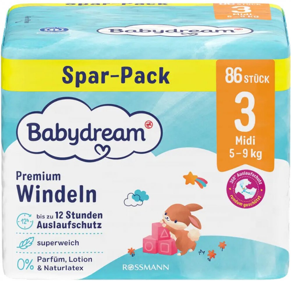 Sametově hebké jednorázové plenky Babydream Premium Midi pro děti od 5 do 9 kg poskytují optimální ochranu citlivé pokožky vašeho dítěte. Zůstávají suché až 12 hodin a mimořádně rychle absorbují tekutinu.
