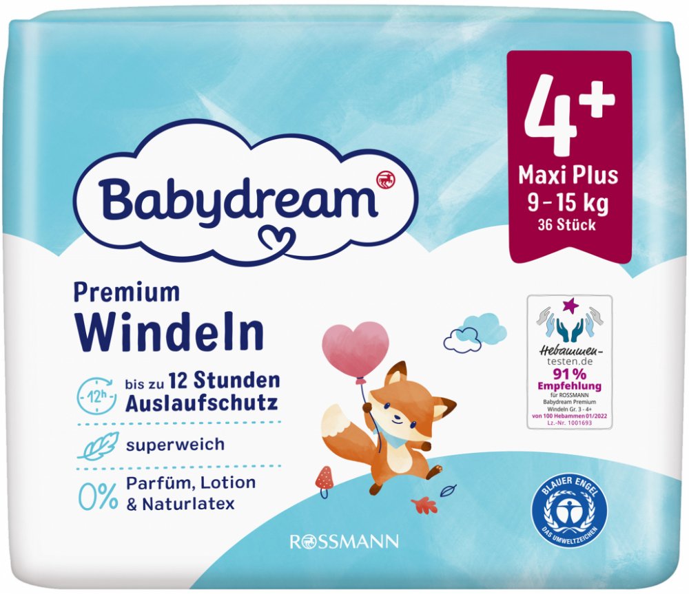 Sametově hebké jednorázové plenky Babydream Premium Maxi+ pro děti od 9 do 15 kg poskytují optimální ochranu citlivé pokožky vašeho dítěte. Zůstávají suché až 12 hodin a mimořádně rychle absorbují tekutinu.