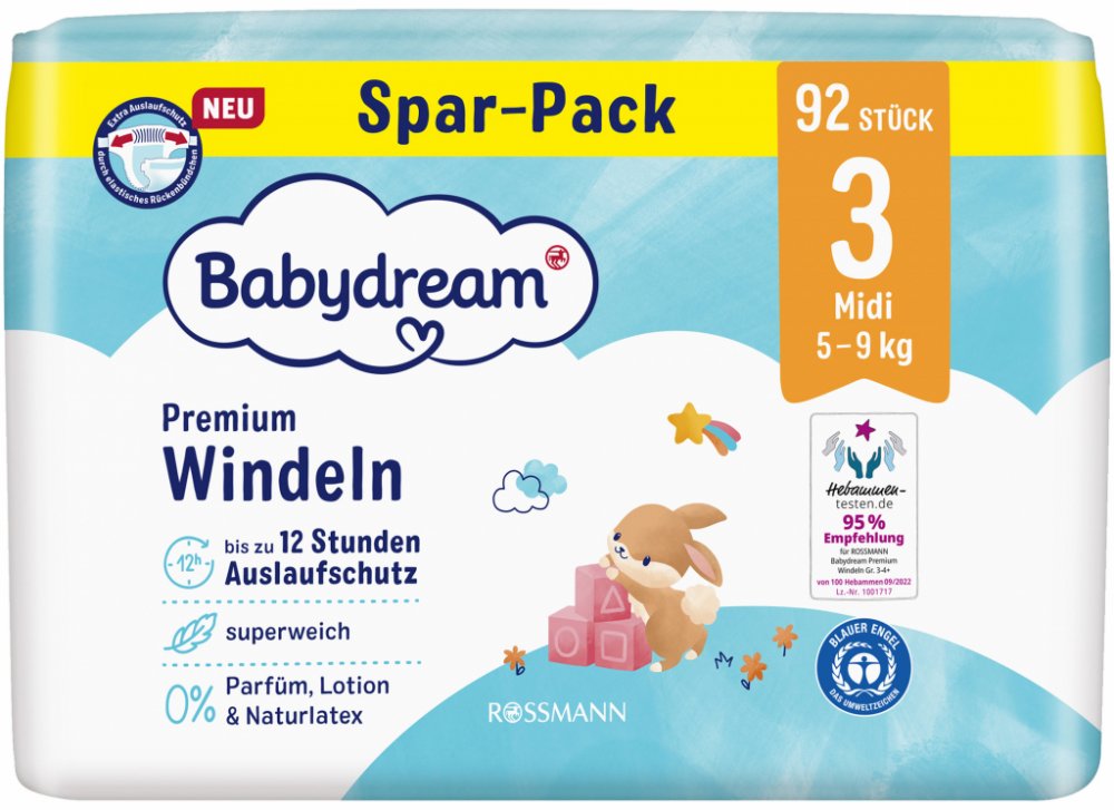 Sametově hebké jednorázové plenky Babydream Premium Midi pro děti od 5 do 9 kg poskytují optimální ochranu citlivé pokožky vašeho dítěte. Zůstávají suché až 12 hodin a mimořádně rychle absorbují tekutinu.