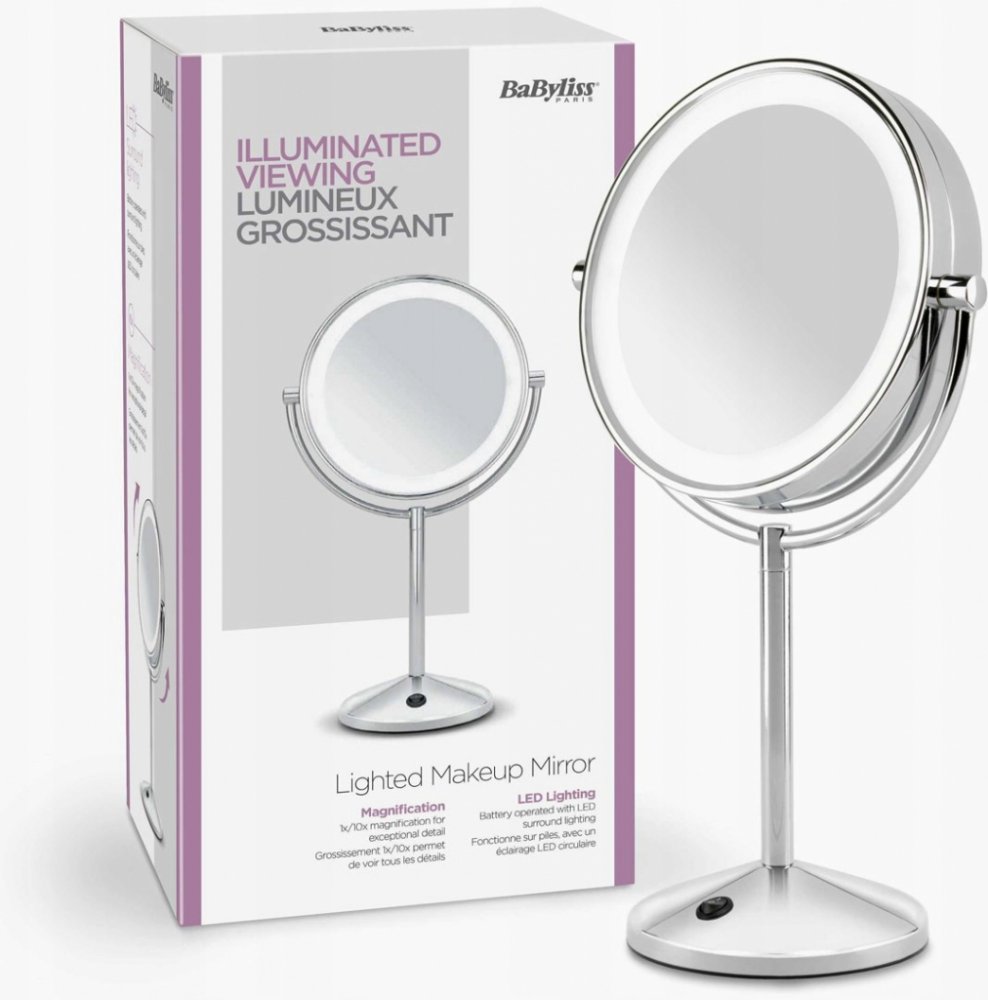 Zrcátko s osvětlením BaByliss Lighted Makeup Mirror disponuje dvěmi zrcadlovými plochami z nichž jedna je 10x zvětšovací. LED světlo přístroje osvětluje velkou zrcadlovou plochu z obou stran. Osvětlení je možné spustit tlačíkem on/off a pomocí tužkových baterií.