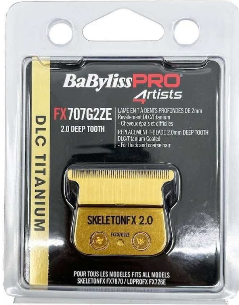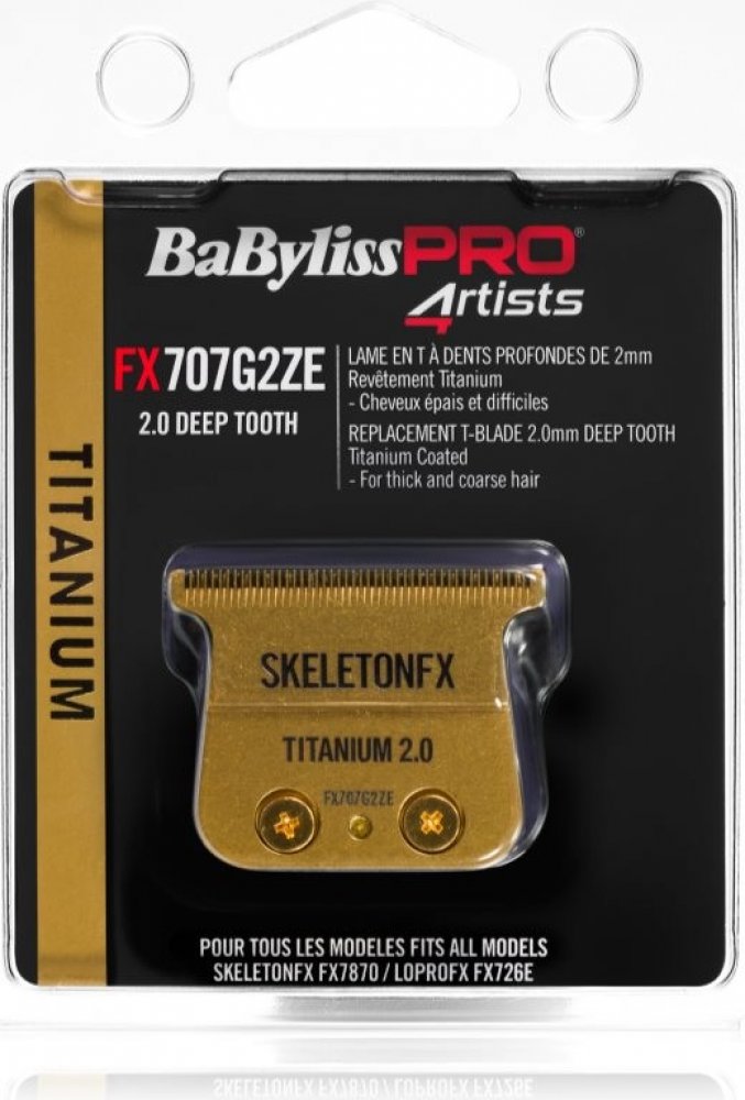 Originální hlavice BABYLISS PRO 4Artists FX707ZE je kompletní náhradní břitva ve tvaru písmene T vyrobená z vysoce kvalitní nerezové oceli s hypoalergenním titanovým povlakem. Jedná se o originální náhradní hlavici pro konturovací strojky BaByliss 4Artists – konkrétně pro modely SKLETONFX (FX7870GE, FX7870BKE a FX7870RE).