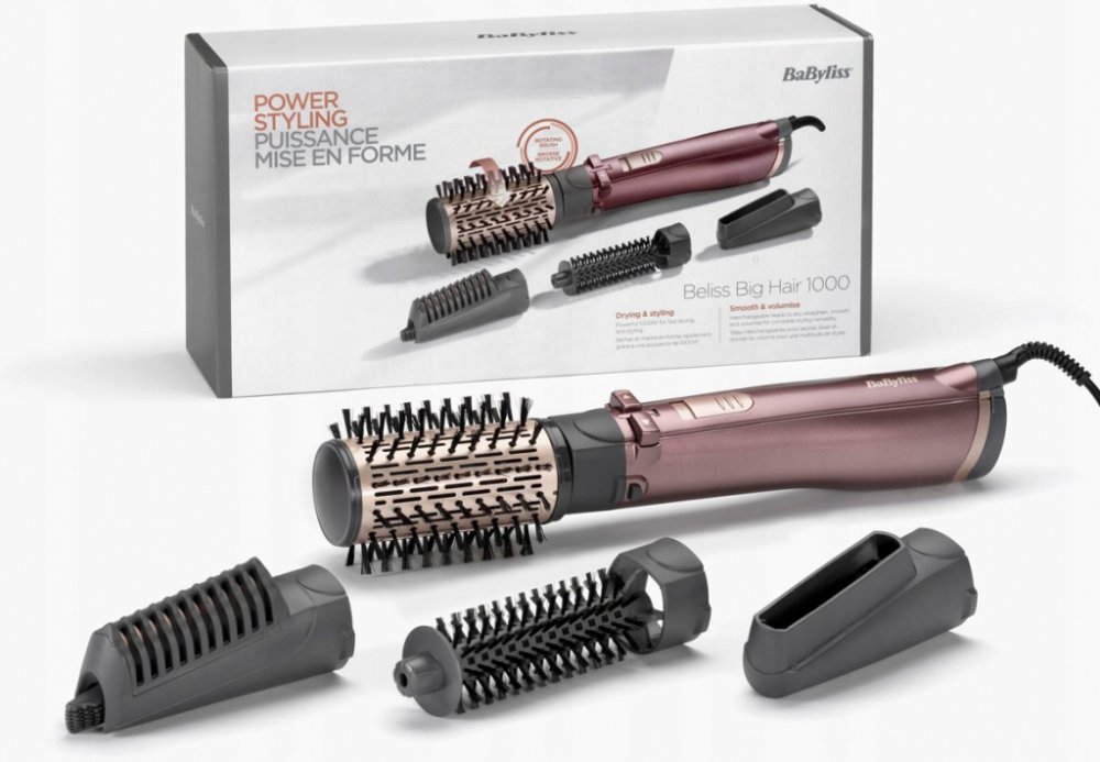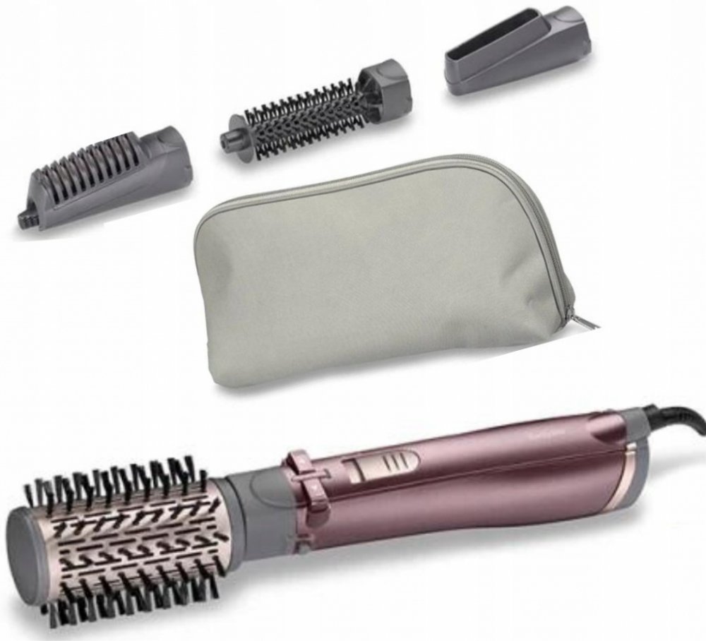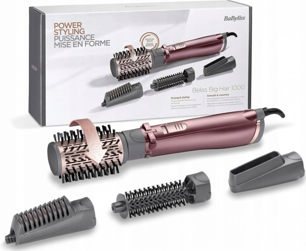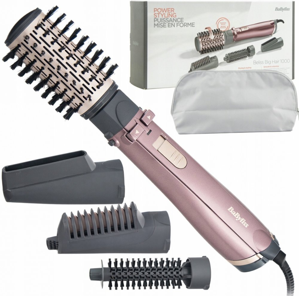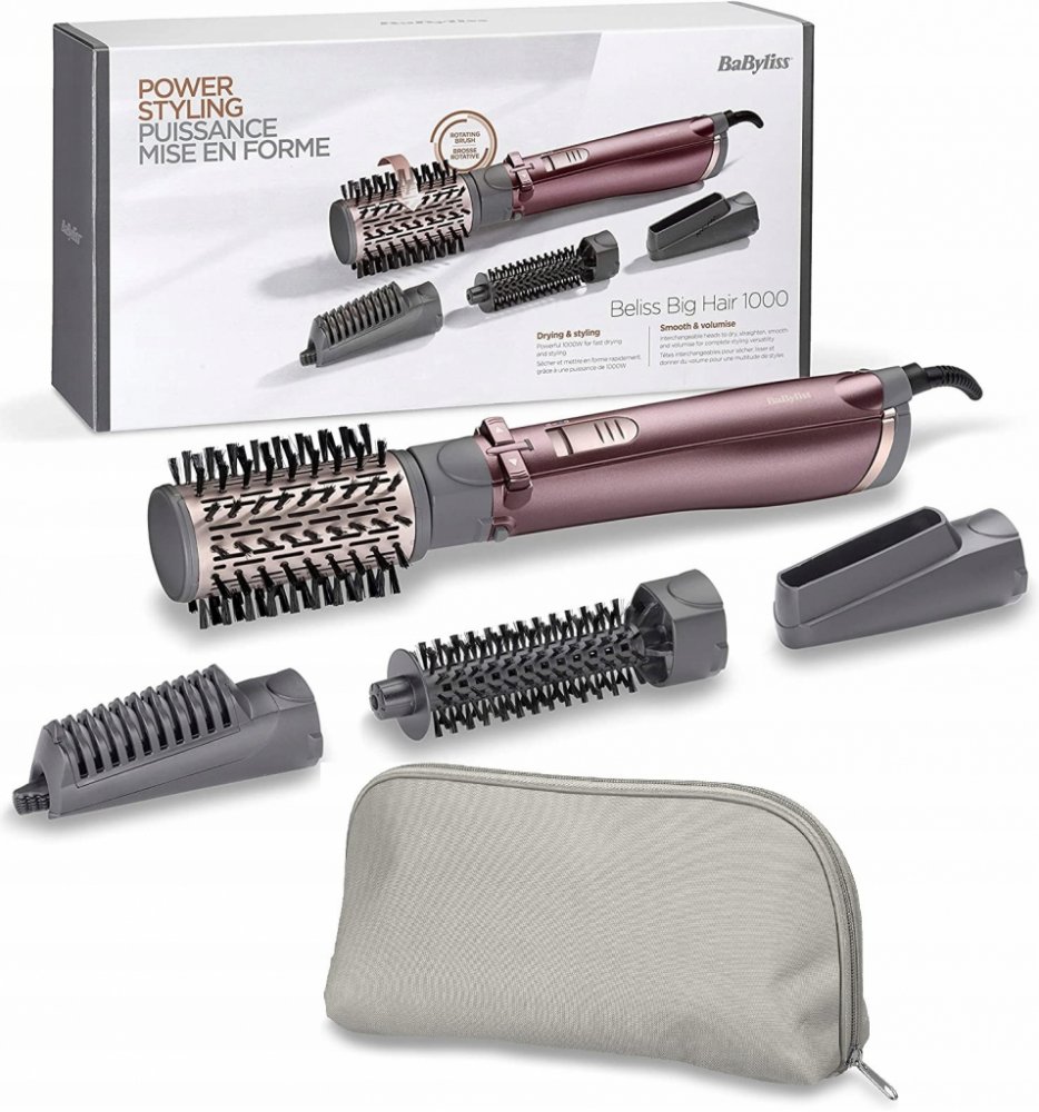 Horkovzdušná rotační kulma Příkon 1000 W 50 mm kartáč s měkkými štětinami 20 mm kartáč s měkkými štětinami Rovnací nástavec Sušící tryska Dva stupně nastavení teploty a jeden stupeň chlazení Ionizace Pouzdro Otočný kabel o délce 1,8 metrů