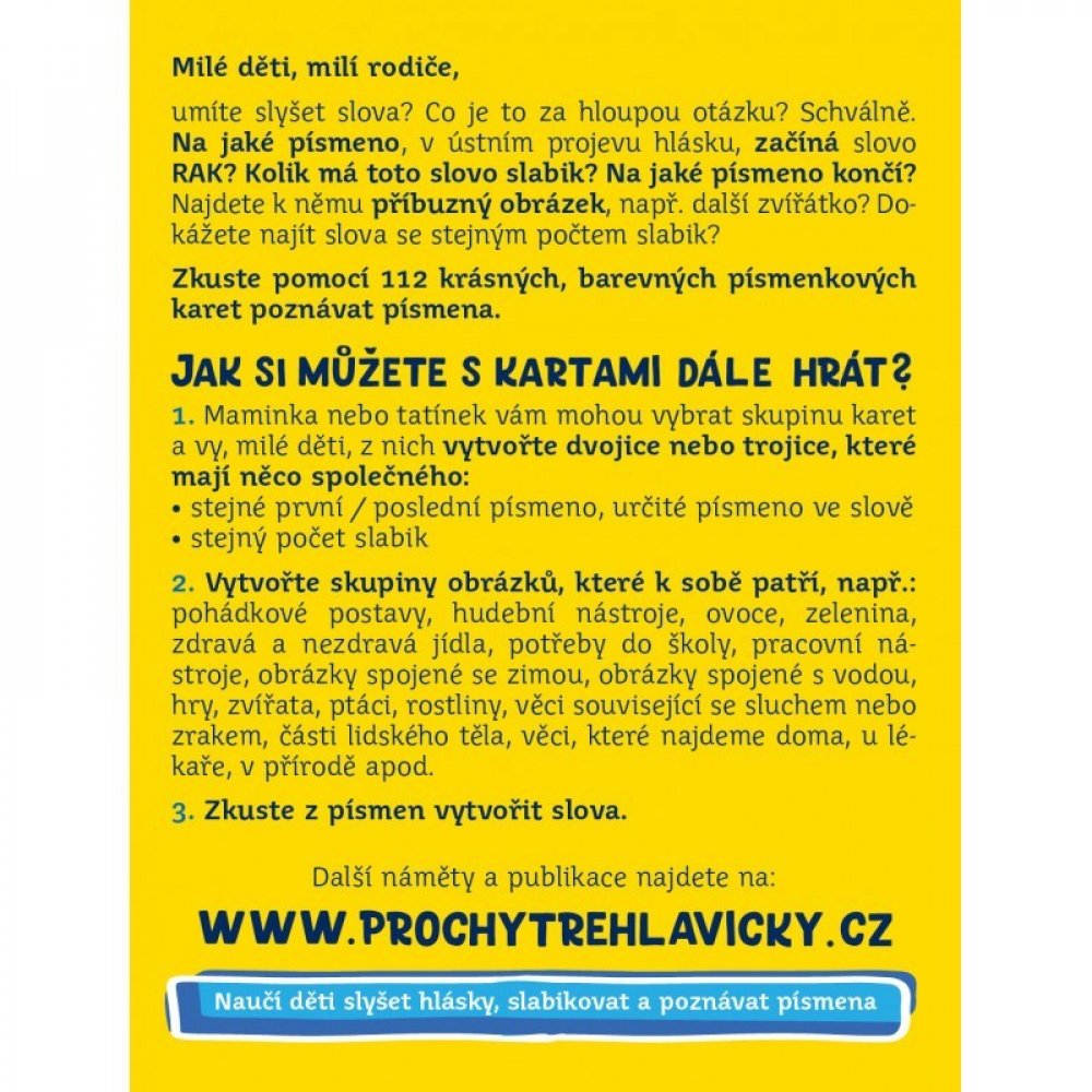 Výuková pomůcka pro předškolní děti, naučí je slyšet hlásky, slabikovat a poznávat písmena české abecedy. Balení obsahuje 112 barevných karet v praktické krabičce. Děti mohou hledat slova se shodným počtem slabik, slova začínající na stejné písmenko, slova z jedné kategorie apod. Kartičky napomáhají i mladším dětem v poznávání obrázků a k rozšíření slovní zásoby.