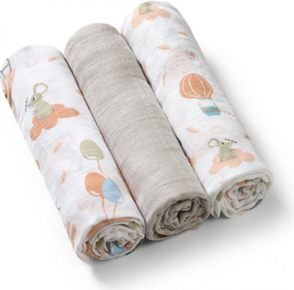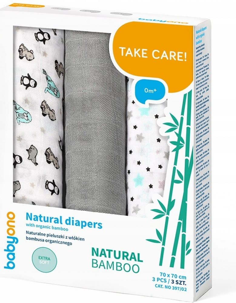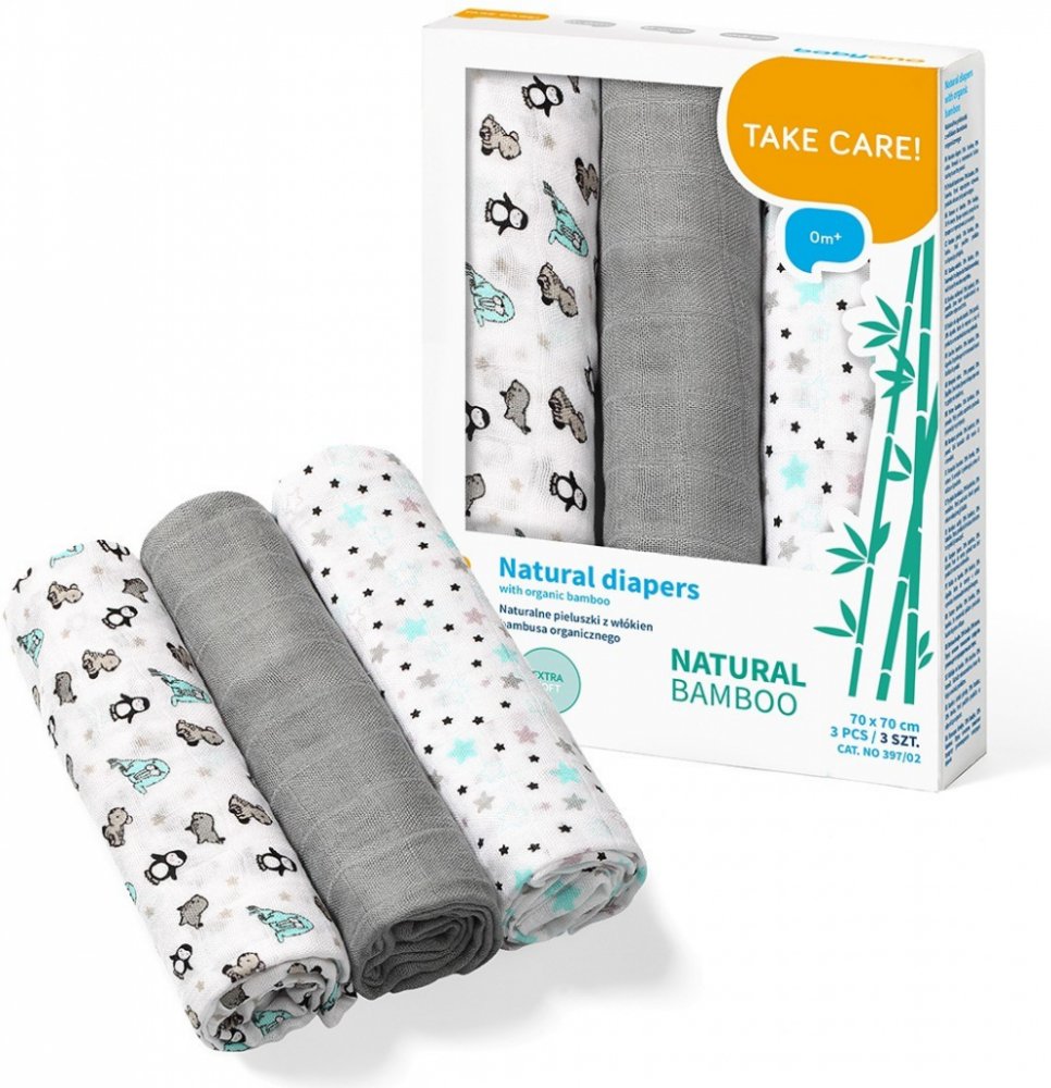 Plenky z bambusových vláken lze používat od prvních dnů života - jako zavinovačku, lehkou deku, přebalovací podložku, prostěradlo nebo praktický ručník. Jsou ideální jako přikrývka při kojení nebo jako podložka na ramena, která chrání oblečení rodičů před močí. Lze je také použít jako plyšový spací pytel nebo lehký přehoz na kočárek. Budou se vám hodit v každé situaci, která vyžaduje blízkost dětské pokožky. Sada obsahuje 3 kusy plenek: 2 z nich jsou zdobené barevnými potisky, třetí je jednobarevná. Jsou zabaleny v průhledném sáčku se zipem.