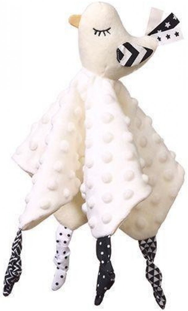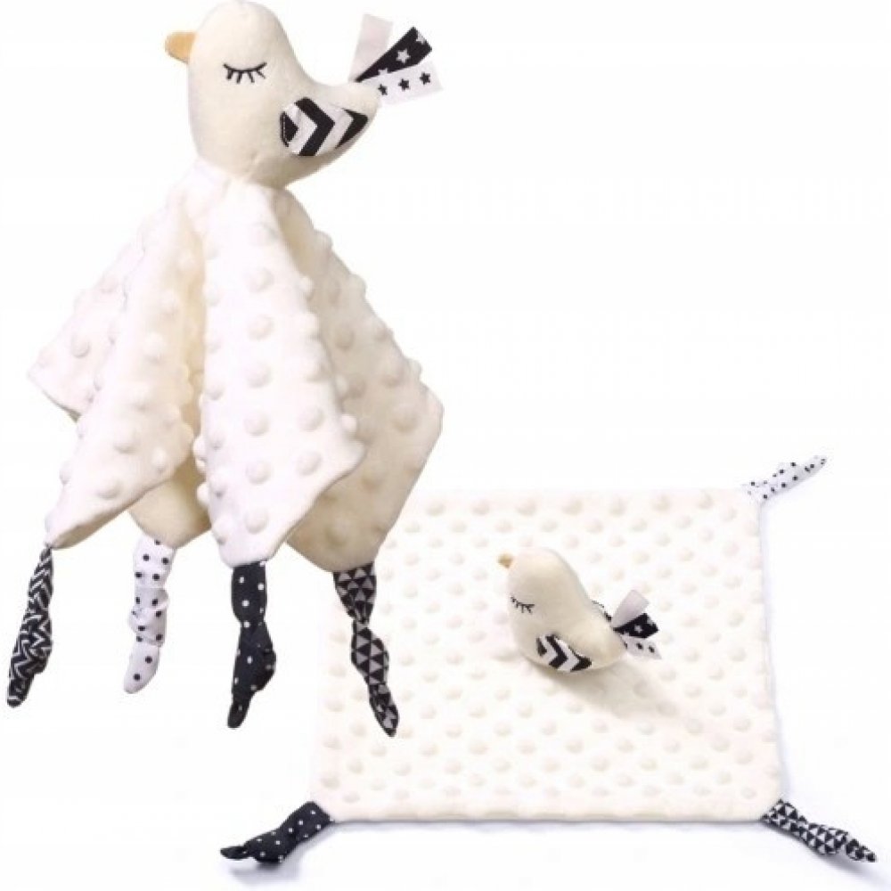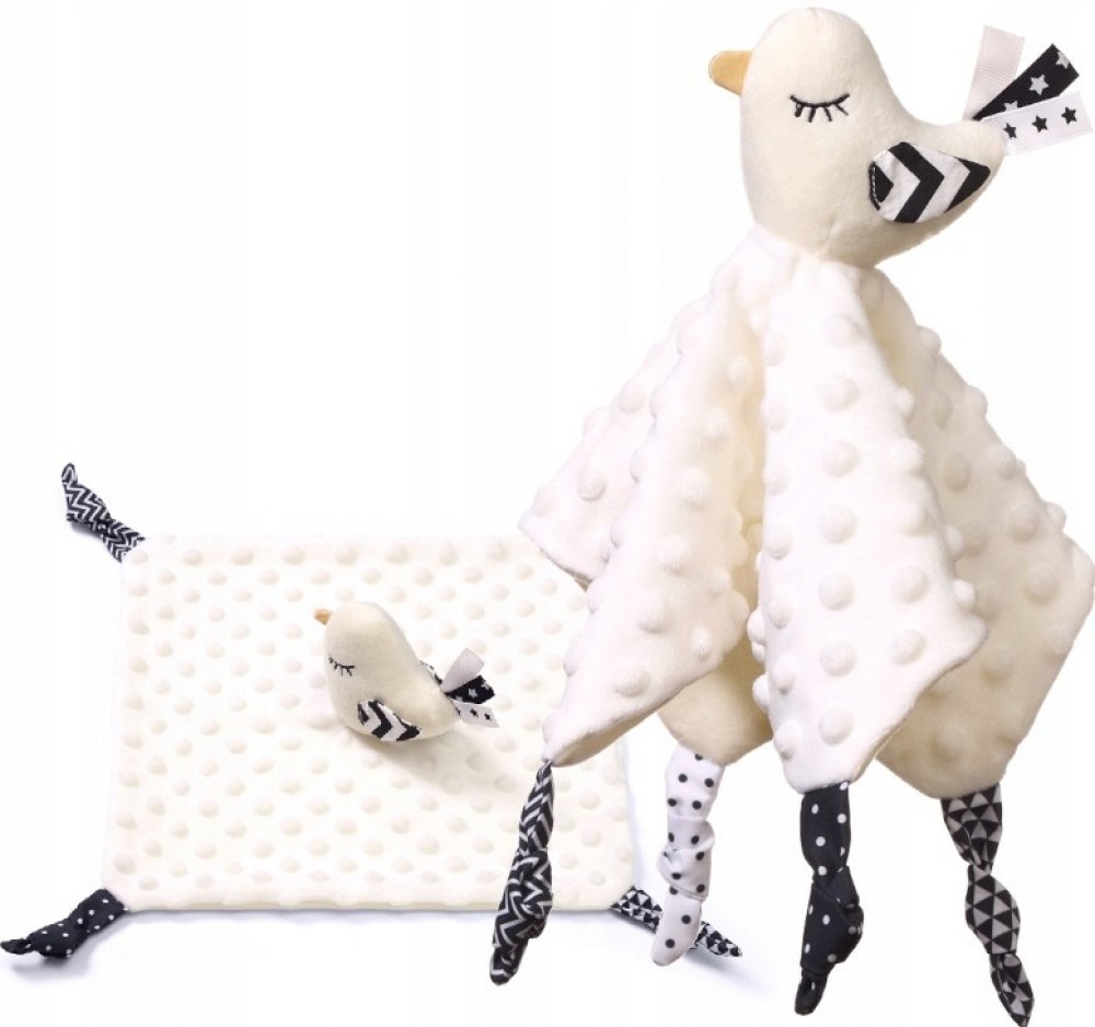 Little Birdie je funkční produkt dva v jednom: deka a plyšová hračka. Je to také vzdělávací hračka. Rozvíjí smysly miminka od prvních dnů života. Minky bavlněný materiál má texturu s drobnými cvočky, které stimulují hmat. Podobně měkké uzly nebo stuhy podporují úchopová cvičení. Materiál je vzdušný a jemný.