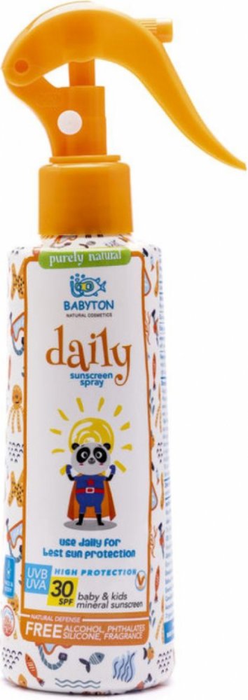 BABYTON opalovací krém Daily 200ml Babyton Opalovací krém pro děti SPF 30 DAILY poskytuje přírodní ochranu pokožky založenou na minerálním filtru, který účinně blokuje škodlivé UVA i UVB paprsky bez použití chemických přísad. Díky jemnému, šetrnému složení bez nanočástic je vhodný i pro velmi citlivou dětskou pokožku. Vlastnosti: - krém se snadno roztírá, rychle vstřebává, nezanechává na kůži bílé stopy a je voděodolný - ideální pro každodenní péči celé rodiny, kdykoliv jste venku na slunci - snadný sprejový aplikátor - rodinné balení 200 ml
