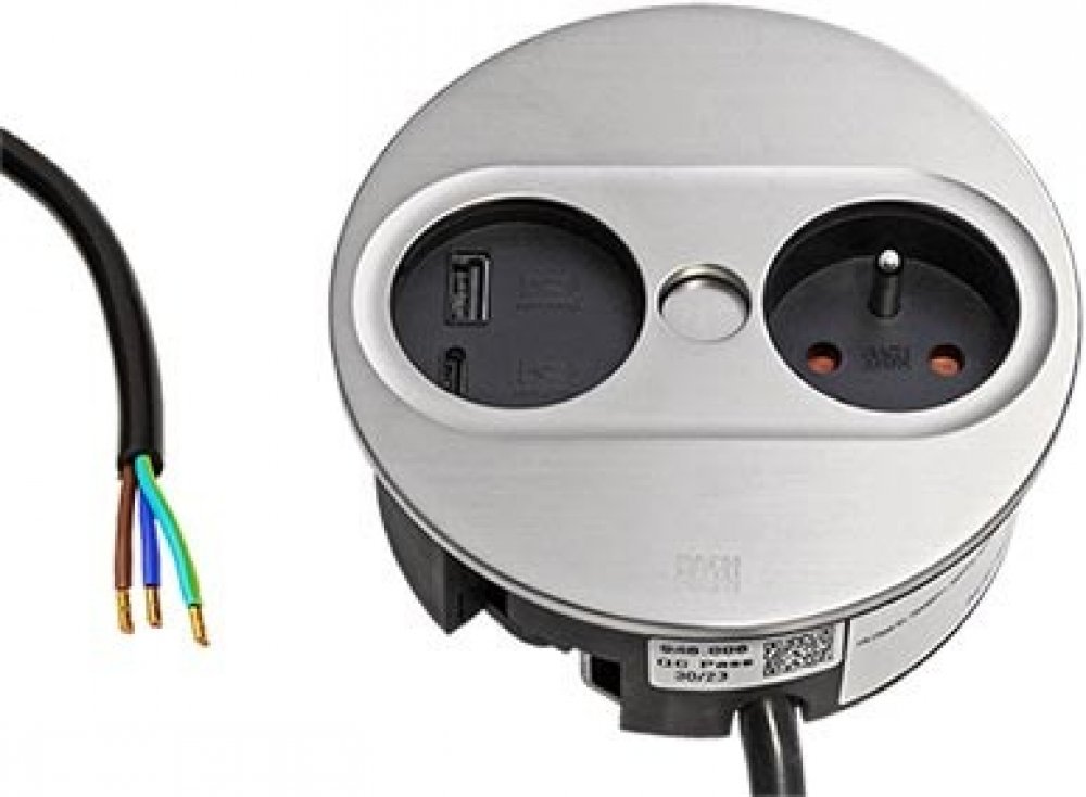 Použití: Box s jednou napájecí zásuvkou a nabíjecími porty, určený pro montáž do desky stolu.;