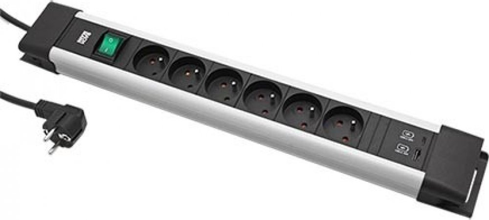 Šestinásobná zásuvka s vypínačem, USB napájecím zdrojem a prodlužovacím kabelem. Zásuvky typ E (české), vidlice typ E/F (univerzální pro zásuvky s ochranným kolíkem nebo bočními kontakty).;