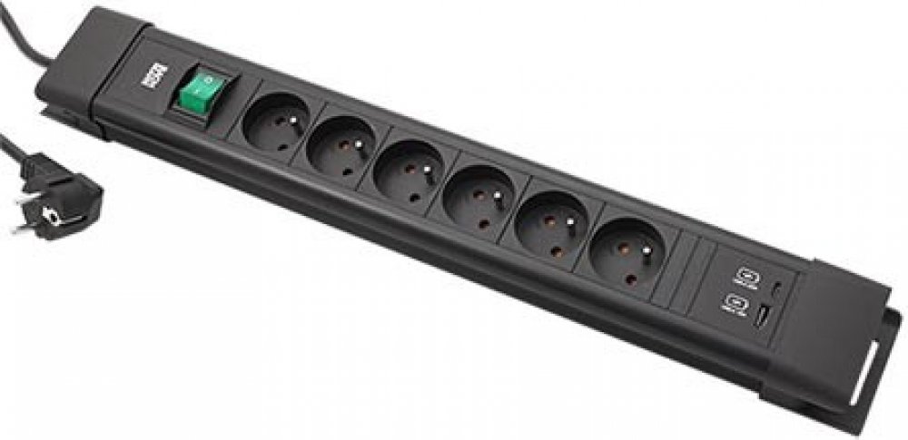 Šestinásobná zásuvka s vypínačem, USB napájecím zdrojem a prodlužovacím kabelem. Zásuvky typ E (české), vidlice typ E/F (univerzální pro zásuvky s ochranným kolíkem nebo bočními kontakty).;