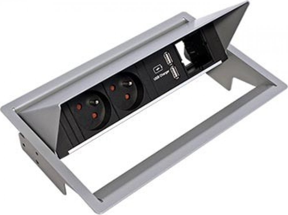Použití: Elegantní, výklopné přípojné místo v úrovni stolu. Umožňuje snadnou montáž do otvoru v desce stolu. Box s jednou zásuvkou, USB nabíječkou a uživatelsky konfigurovatelným modulem. Po zapojení je možno držák sklopit a přípojné místo tak nevyčnívá nad úroveň stolu. Nízká vestavná hloubka dovoluje montáž i ve stísněných prostorech.;