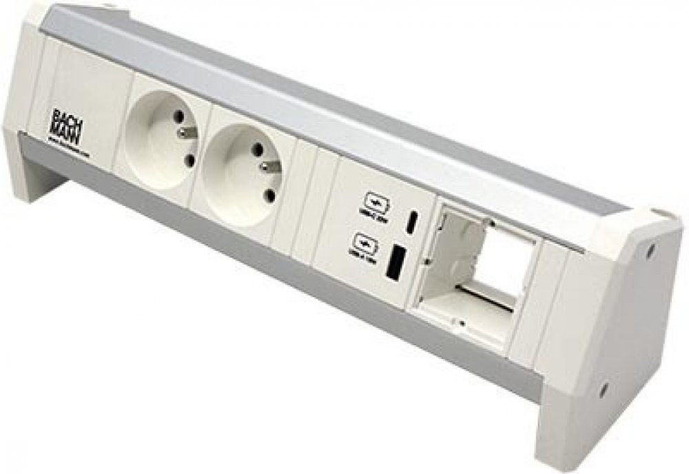 Použití: Elegantní pevné přípojné místo jednoduše montovatelné na stolní desku. Umožňuje snadnou montáž na okraj stolu, nebo na plochu stolu pomocí vrutů(nejsou součástí balení). Box se 2 zásuvkami CZ, napájecím modulem 22W (USB A + USB C) a jednou volnou pozicí pro uživatelsky konfigurovatelný modul. Je vybaven bočnicemi pro upevnění na stůl.;