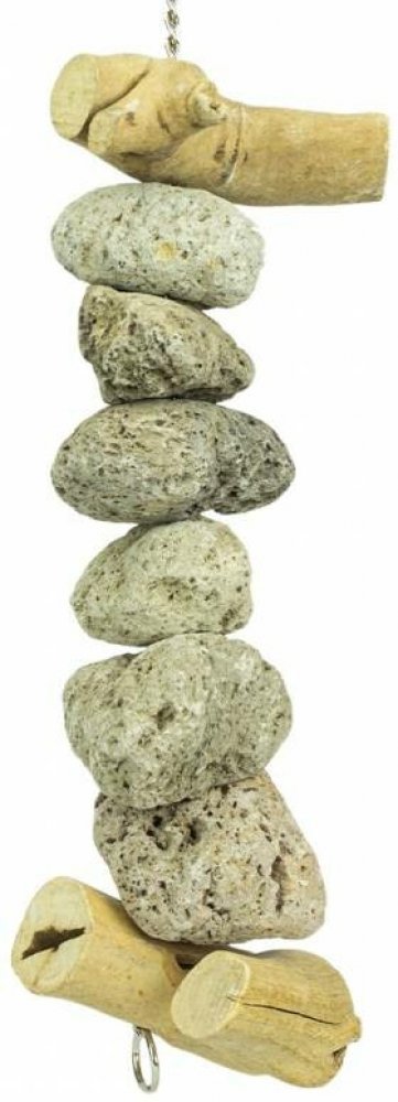 Složení a bezpečnost: Přírodní lávový kámen, javové dřevo, kovová karabina. Materiály jsou netoxické a bezpečné pro styk s potravinami (zobákem).