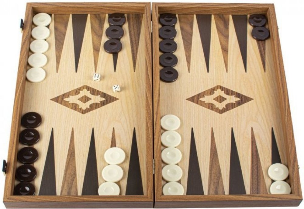 Dřevo: ořechové Rozměry: 30 x 15 xm Hmotnost: 0,8 kg Výroba: Řecko Žetony dřevěné: 30 kusů, průměr 1,8 cm (15 hnědých a 15 bílých) Kostky plastové: Čtyři, rozměry: 10 x 10 x 10 mm Jedna, rozměry 18 x 18 x 18 mm Backgammon je desková hra pro dva hráče, která se hraje s 15 kameny na každé straně a s kostkami. Cílem hry je posunout všechny své kameny podle hodů kostkou a poté je odstranit...