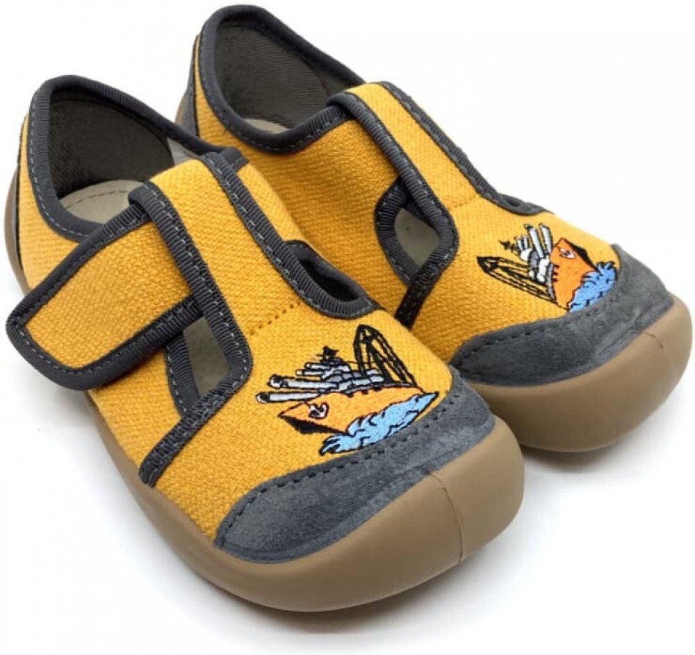 Barefoot bačkory 3F "Freedom For Feet" typ 3BS3/13 Loď v hořčicové barvě s výšivkou lodi. Praktická světle hnědá podrážka s ochranou špičky a paty.