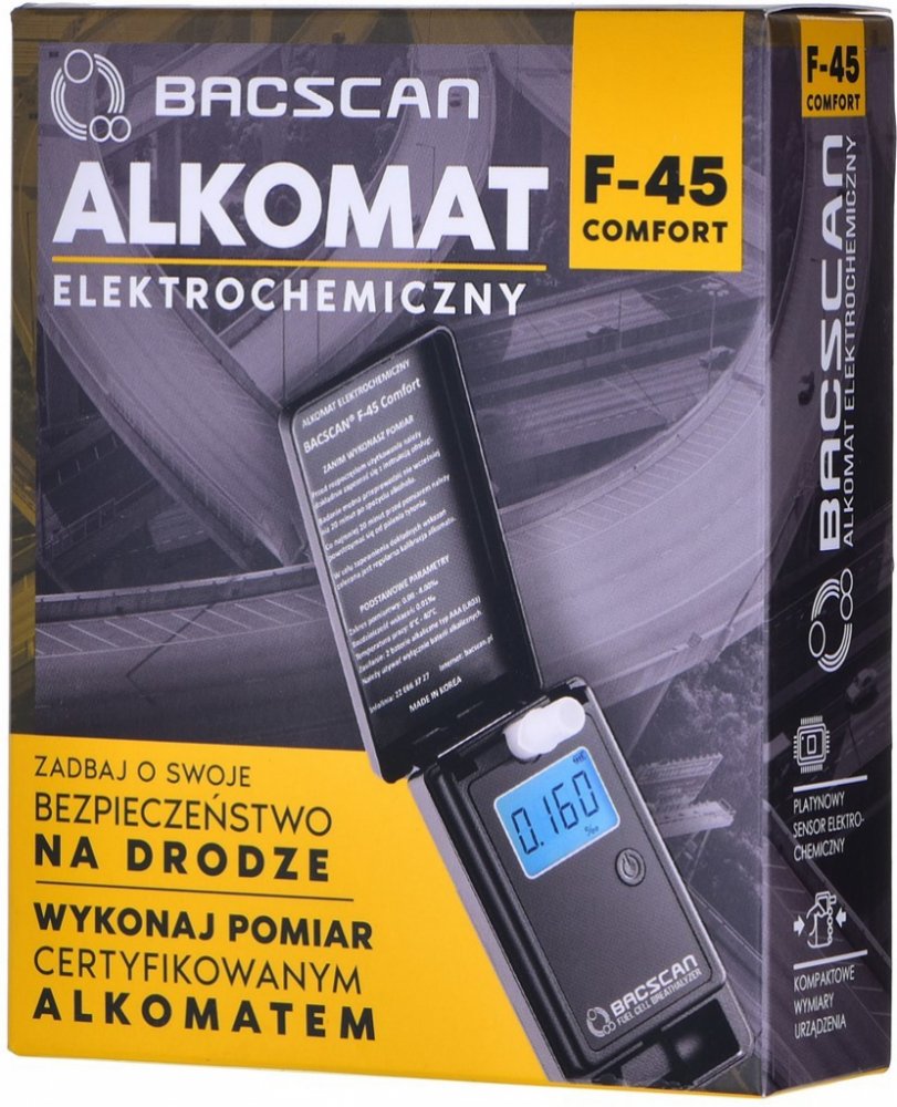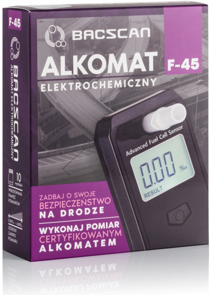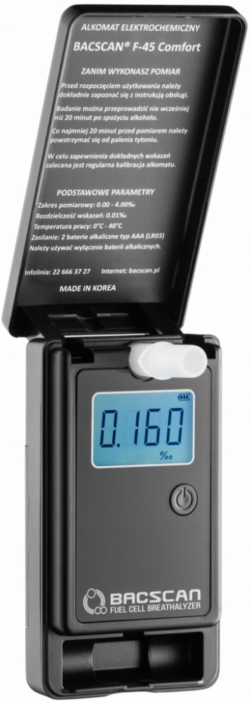 Dechový analyzátor BACscan F-45 má vestavěný snímač průtoku vzduchu, systém chránící měřicí buňku před poškozením v důsledku nesprávně provedené zkoušky, počítadlo počtu provedených měření a funkci připomínající kalibraci.