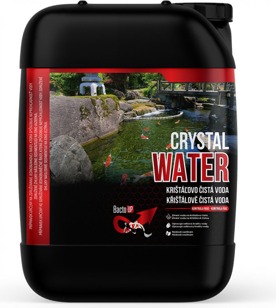 CRYSTAL WATER – Křišťálově čistá voda pro vaše jezírkoCrystal Water je účinný přípravek určený k odstranění zákalu vody a zlepšení její průzračnosti. Díky speciálnímu složení se rychle váže na nečistoty, řasy i těžké kovy, které následně klesnou ke dnu a lze je snadno odstranit pomocí síťky, podběráku nebo jezírkového vysavače. Po aplikaci zůstává voda křišťálově čistá.Hlavní výhody Crystal Water:Okamžitý efekt: Rychle odstraňuje zákal a zanechává vodu čistou a průzračnou. Zlepšení kvality vody: Váže i ty nejjemnější mechanické nečistoty, těžké kovy a fosfáty. Bezpečný pro vodní rostliny: Neohrožuje rostliny ani biologickou rovnováhu jezírka. Univerzální použití: Vhodný pro okrasná jezírka i nádrže s rybami. Jak Crystal Water funguje:Po aplikaci přípravek způsobí shlukování mikroskopických nečistot a řas do větších částic, které se následně usadí na dně nebo se zachytí ve filtraci. Tento proces zajišťuje rychlé projasnění vody a dlouhodobý estetický efekt.Návod k použití:Potřebné množství přípravku smíchejte s vodou v poměru 5 000 ml na 100 000 litrů vody. Rovnoměrně rozlijte po hladině jezírka. Během aplikace zajistěte cirkulaci vody. Po aplikaci odstraňte usazeniny ze dna nebo filtrace. Upozornění:Přípravek přidávejte pouze při dostatečné karbonátové tvrdosti vody (KH ≥ 4). Skladujte v chladu a suchu při teplotě do 30 °C, mimo přímé sluneční světlo. Uchovávejte mimo dosah dětí a domácích zvířat.
