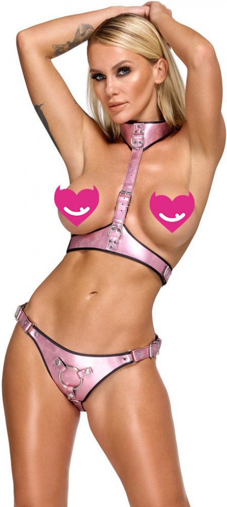 Bad Kitty Chest Harness & Strap on Jock Shimmering Metallic Pink Velikost S/M
