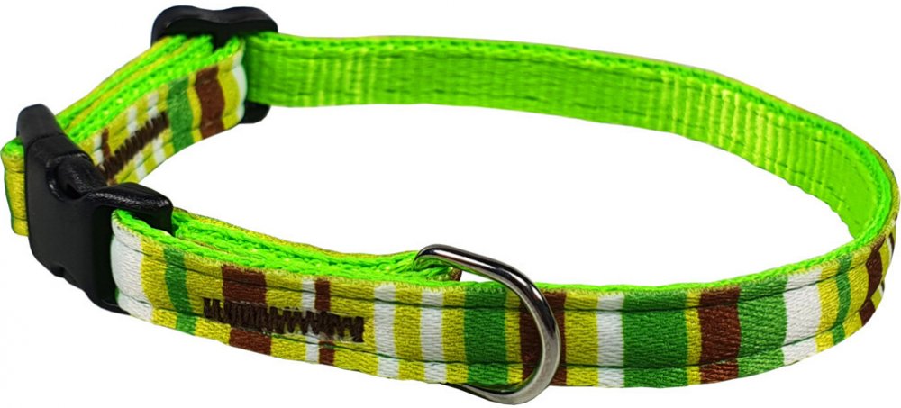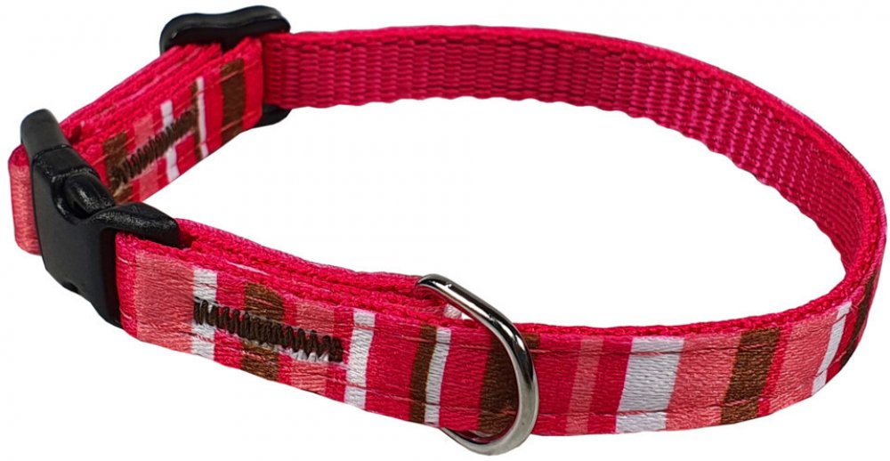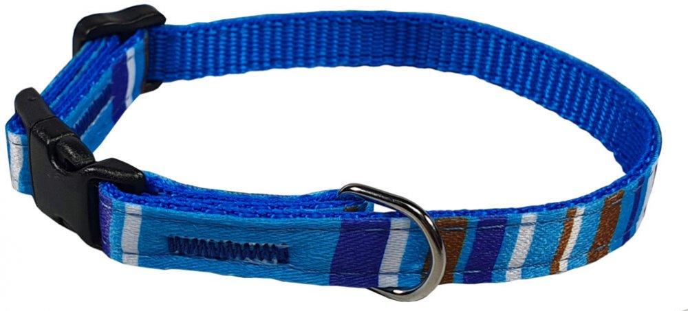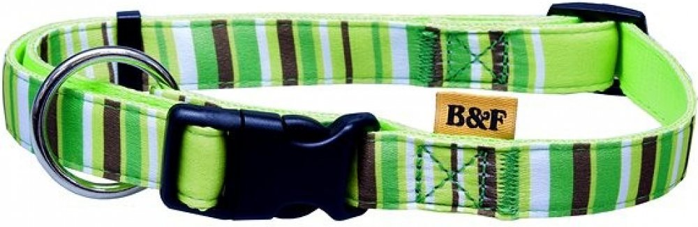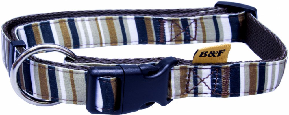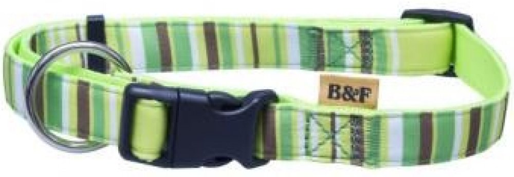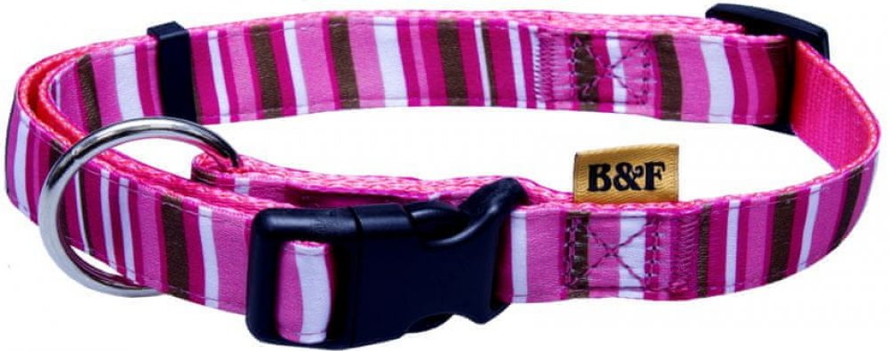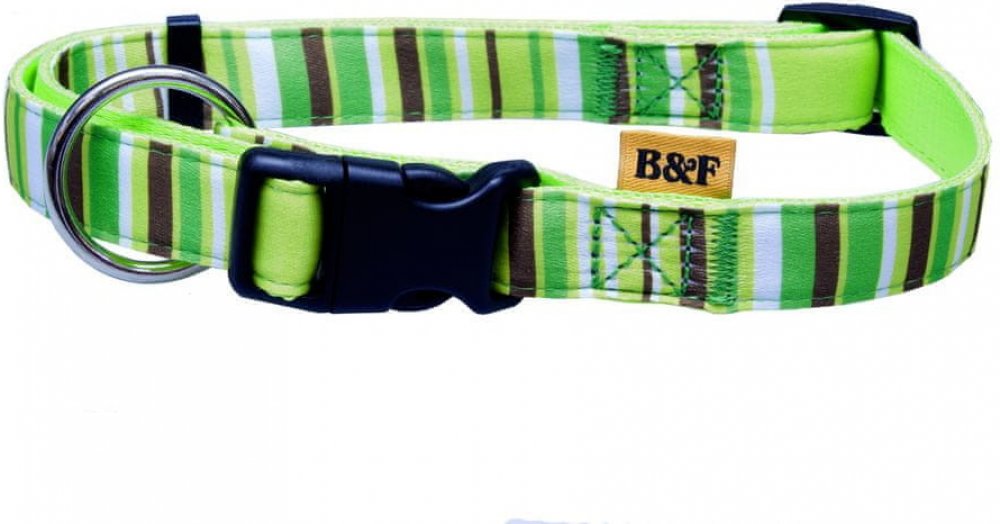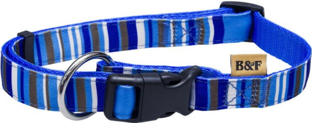 B&F Obojek popruh PROUŽKY je obojek z popruhu s motivem proužku je z velmi měkkého a příjemného materiálu. Zapínání na plastovou přezku, snadno nastavitelný obvod. Před zapnutím provlékneme jistícím kroužkem, který také slouží k připnutí vodítka. Doporučujeme pro střední a velká plemena, varianta široká 10 mm má místo jístícího kroužku svařované kovové déčko a je pak určena pro malá plemena a štěň...