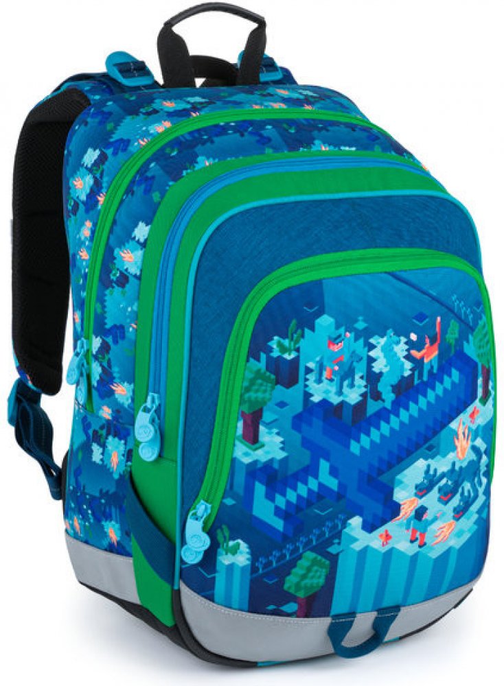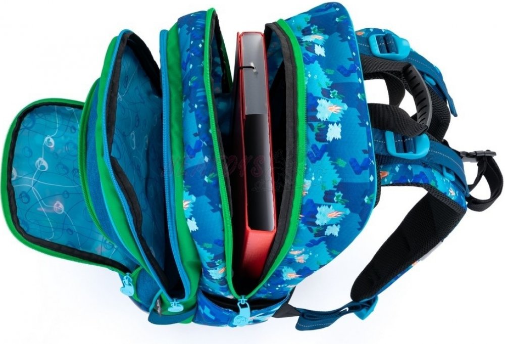 1.-3.třída ZŠ. Tříkomorový školní batoh pro chlapce do první třídy s motivem kostiček a postaviček. Polstrovaný zádový systém se zdravotním posudkem. Prostorný batoh s organizérem. Klip na klíče. Polstrované dno. Plastové nožky. Reflexní prvky. Hmotnost jen 0,92 kg.