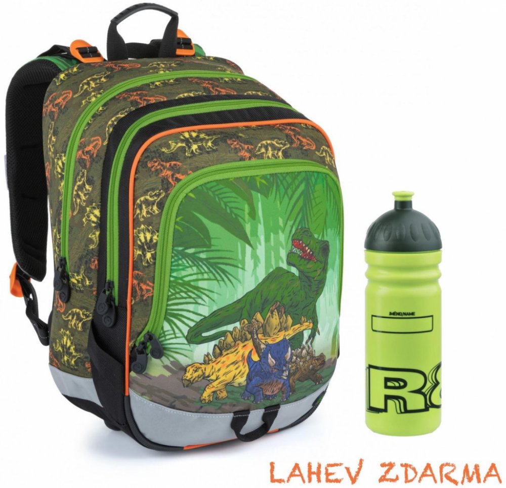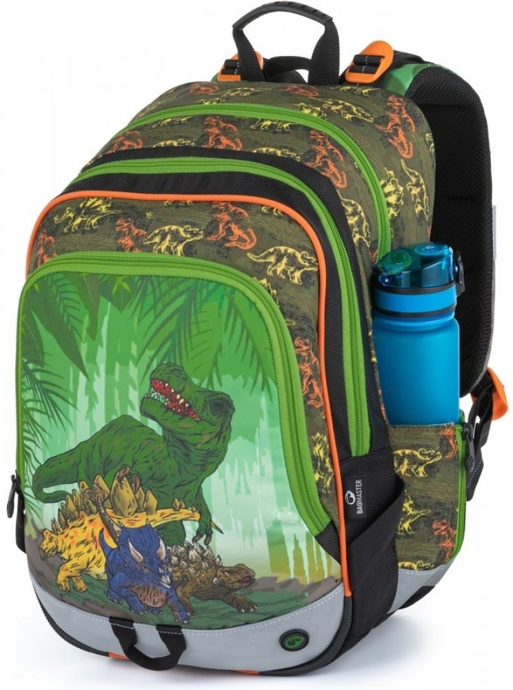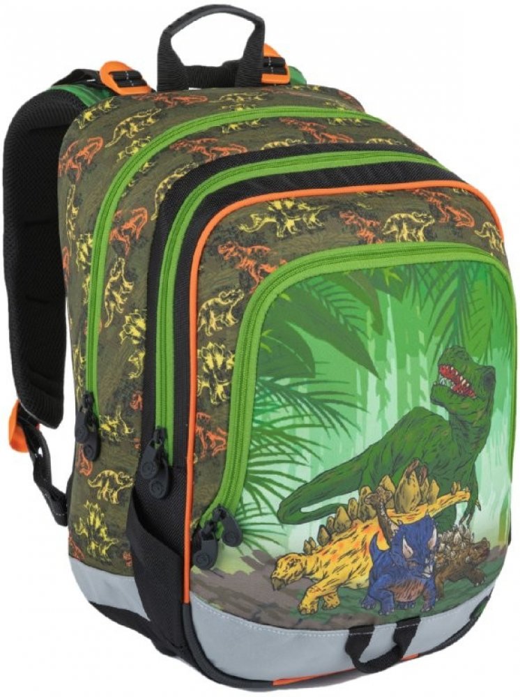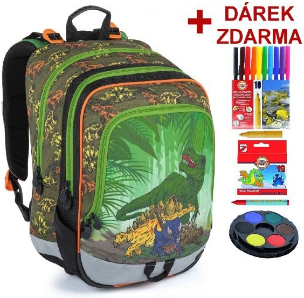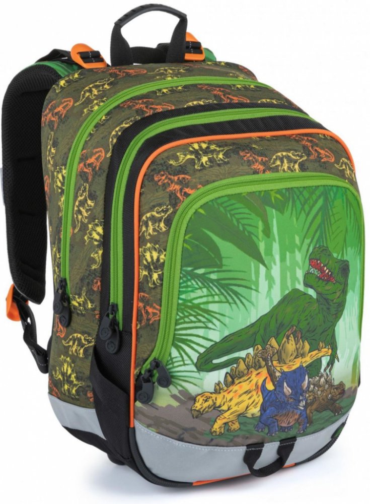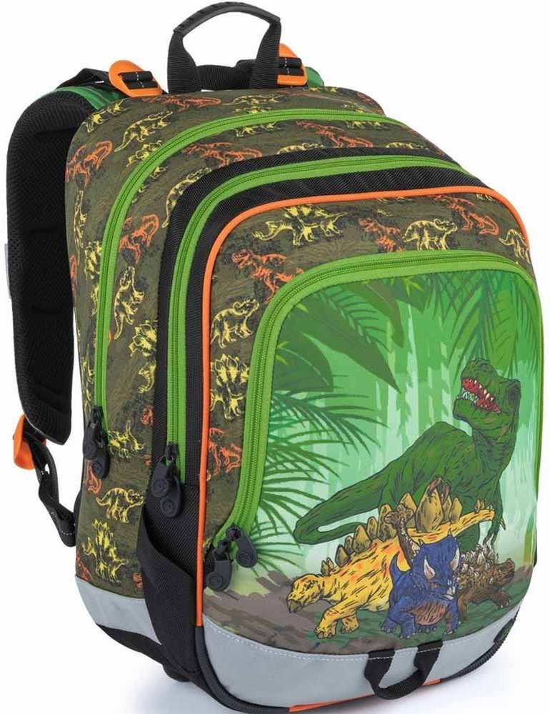 1.-3.třída ZŠ. Tříkomorový školní batoh pro kluky do první třídy s dinosaury. Polstrovaný zádový systém se zdravotním posudkem. Prostorný batoh s organizérem. Klip na klíče. Polstrované dno. Plastové nožky. Reflexní prvky. Hmotnost jen 0,94 kg.