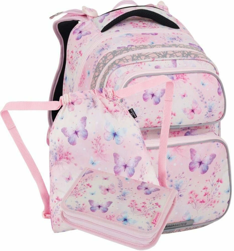 S růžovým dvoukomorovým batohem s třpytivým designem budou všechny malé holky chodit do školy s úsměvem. Díky preciznímu zádovému systému s bederním pásem a váze pod kilogram je vhodný i pro drobnější dítka. Batoh je ideální do první, druhé a třetí třídy. Školačku i rodiče nadchnout bezpečné reflexní prvky, boční kapsy na láhev a další vychytávky.
