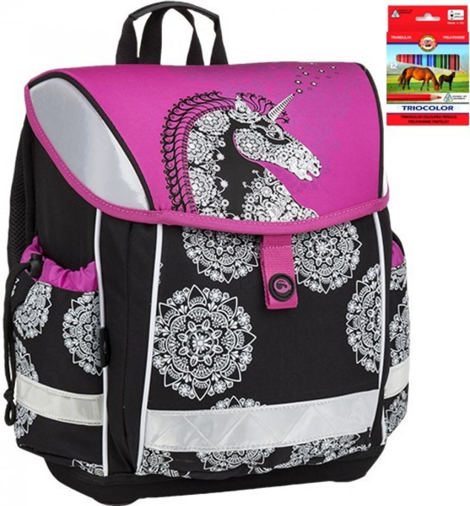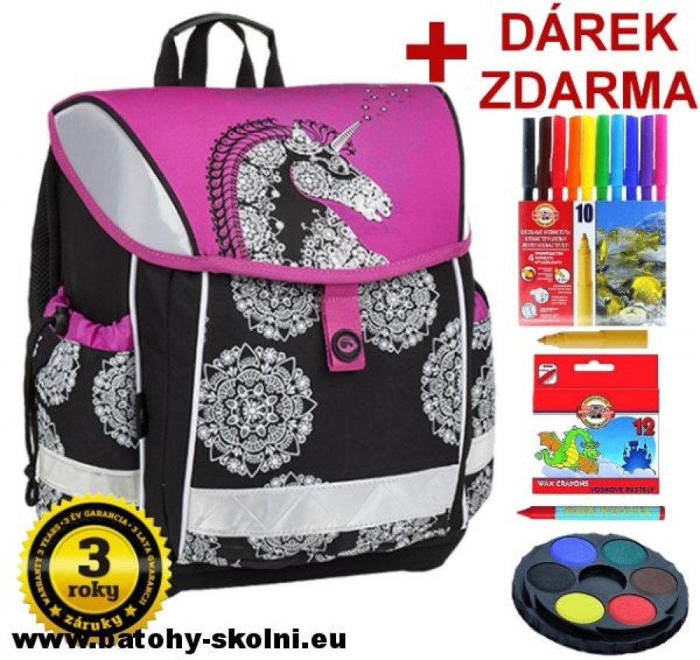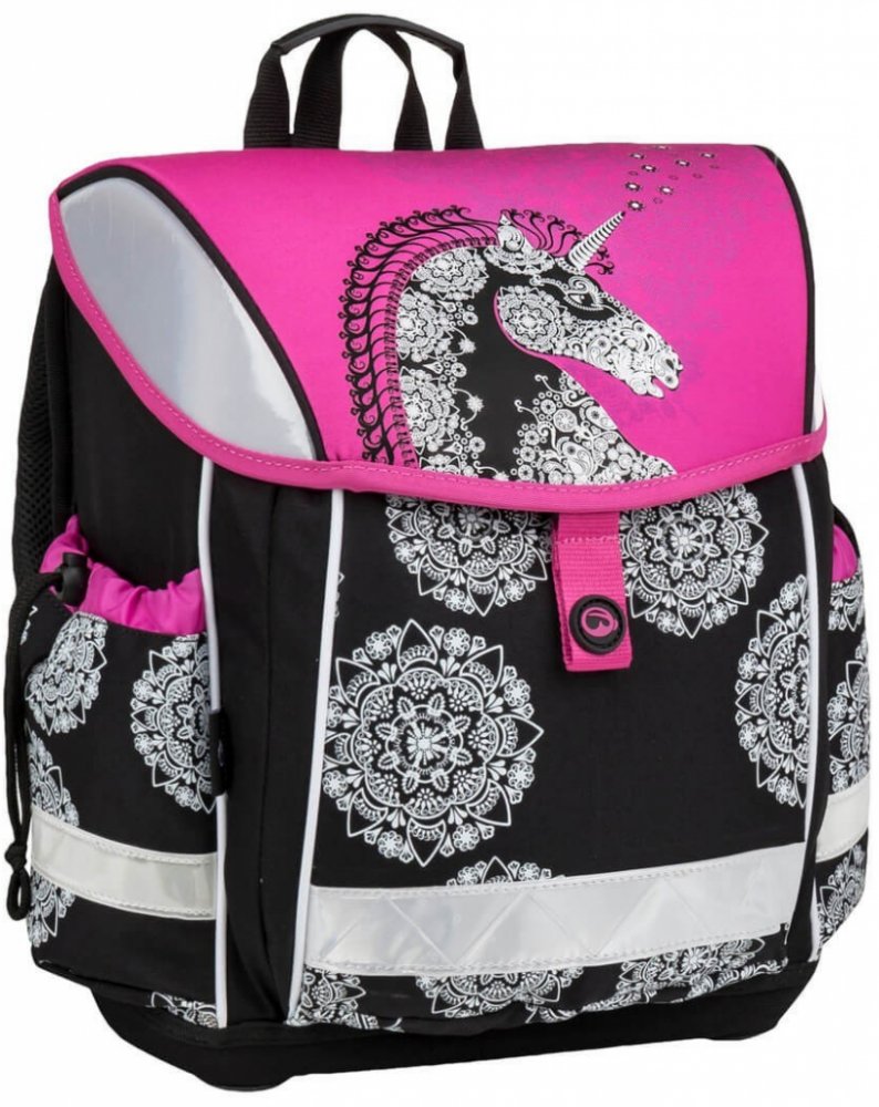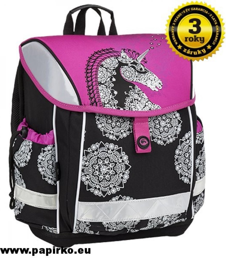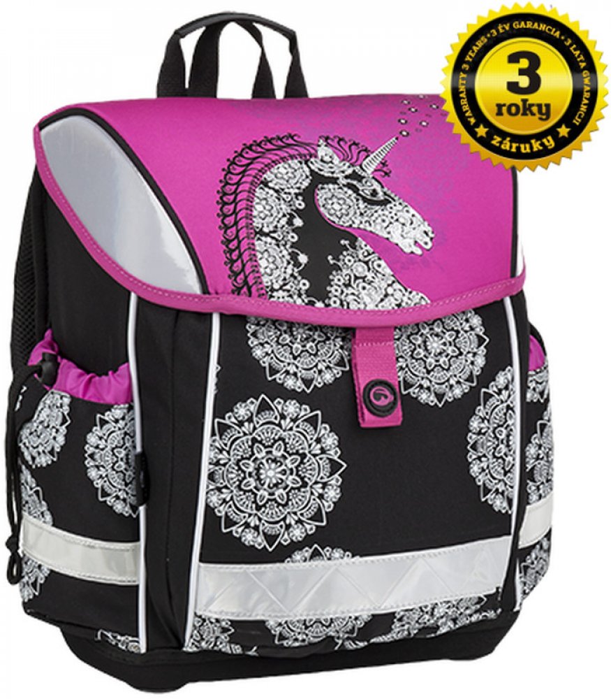 Jednokomorová aktovka od 1.-2. třídy ZŠ. Prostorná s přední kapsou. Dívčí motiv jednorožce. Přehledná hlavní komora, vnitřní separace, boční kapsy na láhev, stabilní pevné dno, plastové nožky. Zapínání na kovový zámeček s odrazkou. Reflexní prvky splňující normy EU/EN.