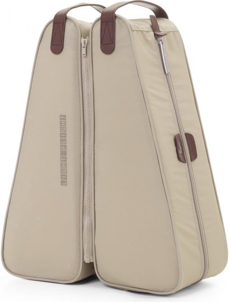 ultralehký béžový cestovní obal 156g v elegantním designu s koženými komponenty na uložení pravé a levé boty odděleně, uzavíráním pomocí YKK a perforováním pro optimální odvětrávání