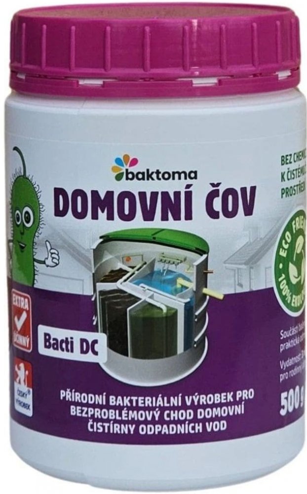 Bacti DC je určený k rozkladu zbytkových organických nečistot v domovní čistírně odpadních vod. Optimalizuje chod domovní čističky odpadních vod tím, že odstraňuje zbytkový kal a usazeniny, a tak zajišťuje bezporuchový chod čistírny odpadních vod, předchází ucpávání potrubí a zamezí tvorbě nepříjemného zápachu.