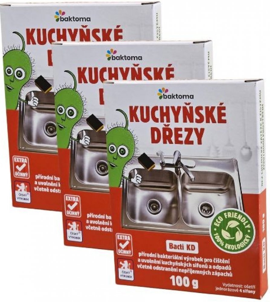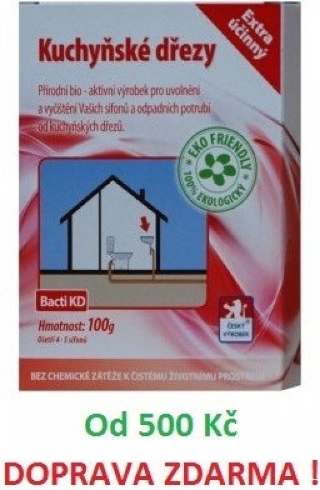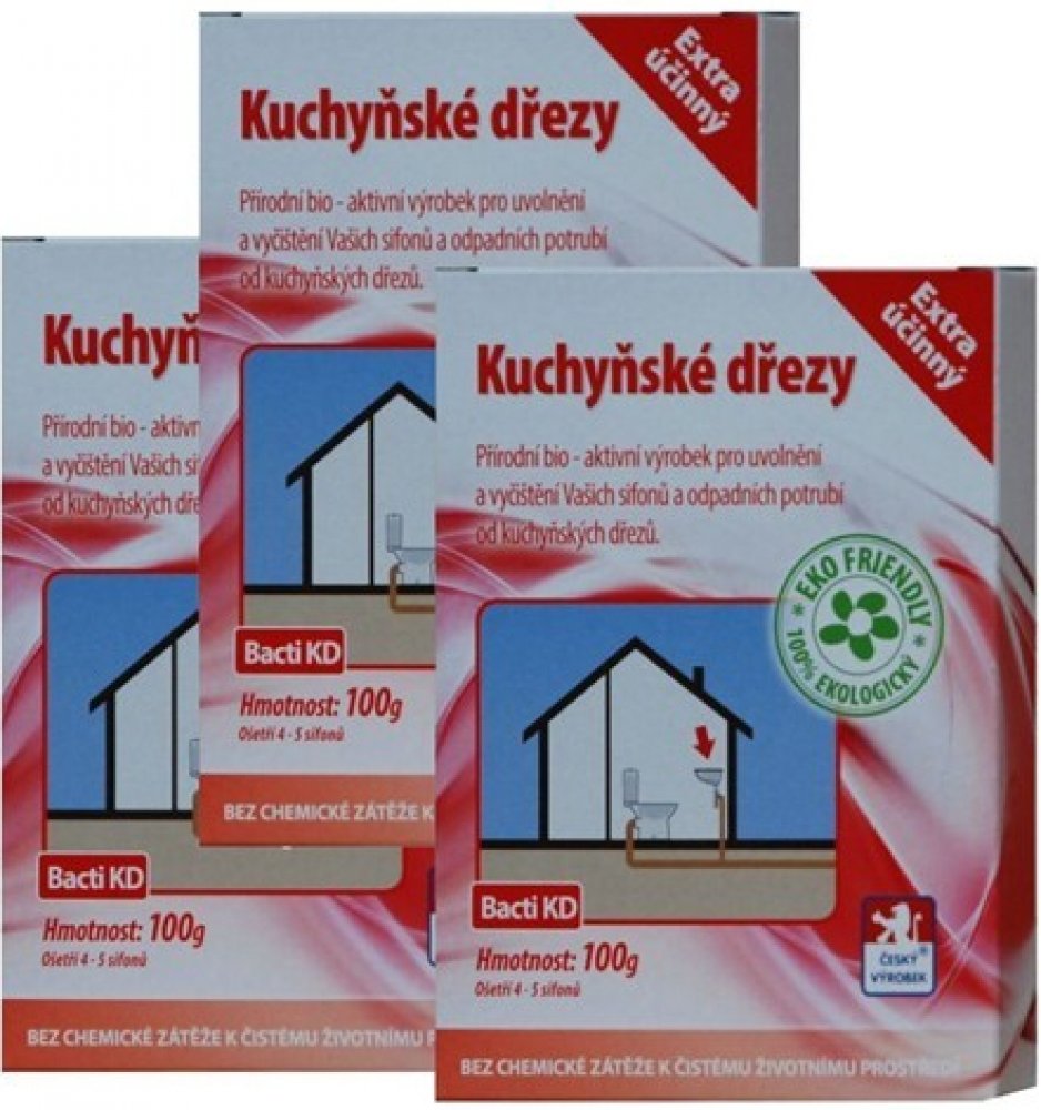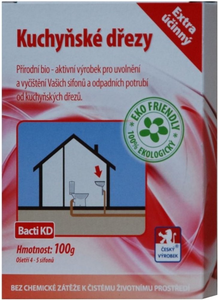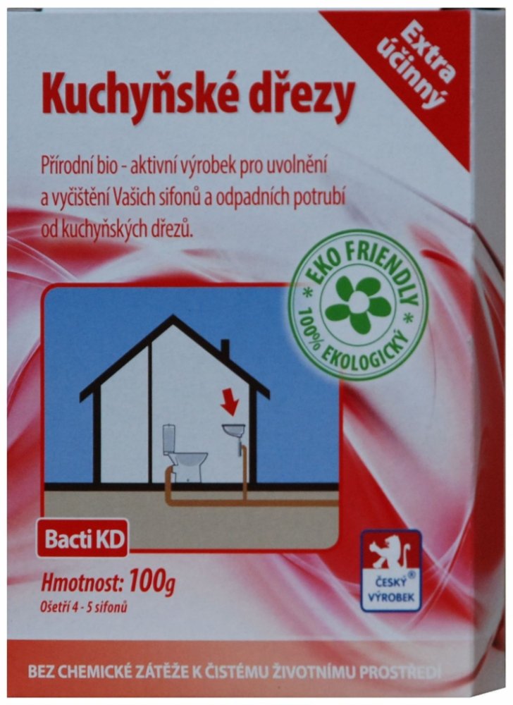 Bacti KD je zcela přírodní a ekologický vysoce účinný biologický prostředek. Je určen k uvolnění a zprůchodnění ucpaného a zaneseného odpadního potrubí a sifonu kuchyňkého dřezu. Při jeho používání dochází k odstranění nepříjemného zápachu vycházejícího ze sifonu nebo odpadního systému. Při pravidelném používání Bacti KD je ošetřováno celé odpadní potrubí.