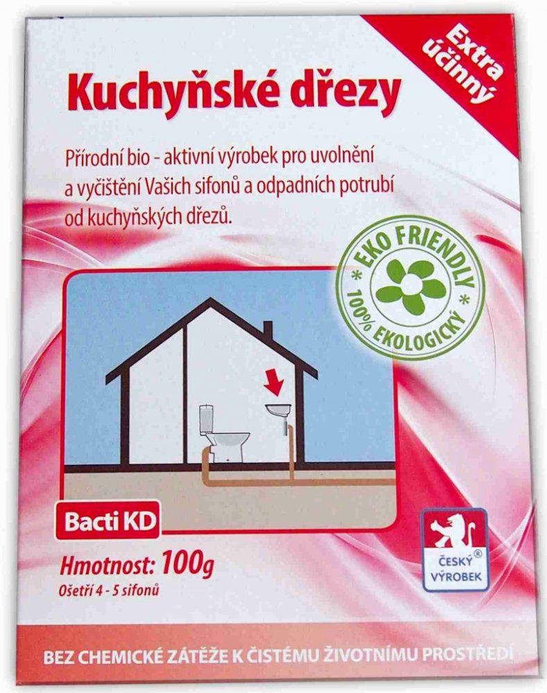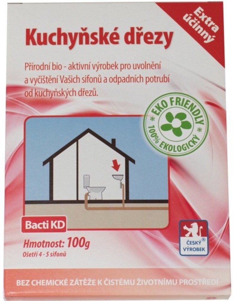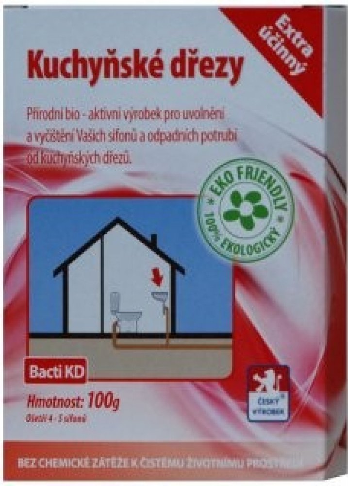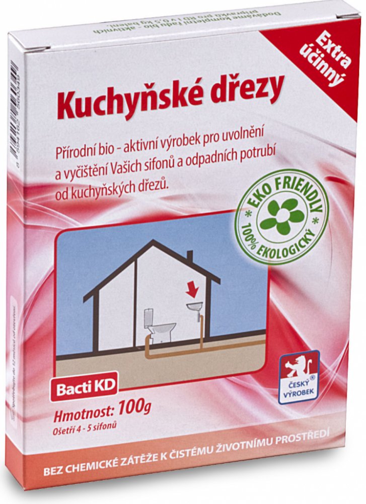 Bacti KD je zcela přírodní a ekologický vysoce účinný biologický prostředek. Je určen k uvolnění a zprůchodnění ucpaného a zaneseného odpadního potrubí a sifonu kuchyňkého dřezu. Při jeho používání dochází k odstranění nepříjemného zápachu vycházejícího ze sifonu nebo odpadního systému. Při pravidelném používání Bacti KD je ošetřováno celé odpadní potrubí.