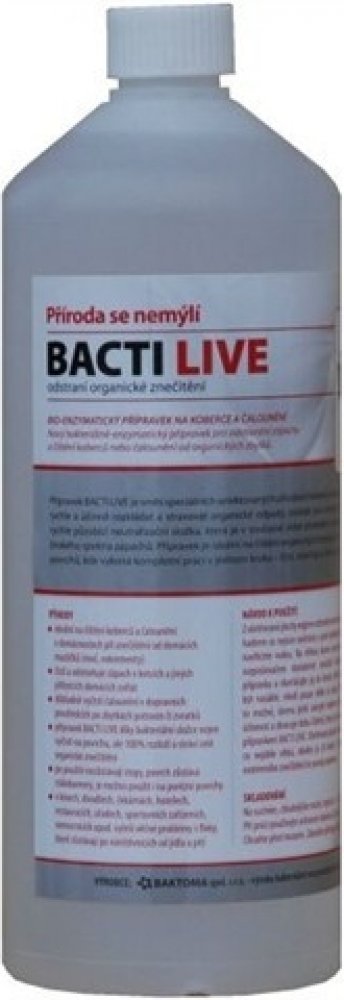 Bacti LIVE je směs speciálních selektovaných přírodních bakterií produkující enzymy, které jsou pěstované pro svoji schopnost rychle a účinně rozkládat a stravovat organické odpady, protože jsou zdrojem zápachu. Přípravek je ideální na čištění organických zbytků po moči, výkalech, zvratcích či potravin ze všech textilních povrchů, kde vykoná kompletní práci v jednom kroku – čistí, osvěžuje a likviduje zápach tím, že rozloží a stráví jeho zdroj.