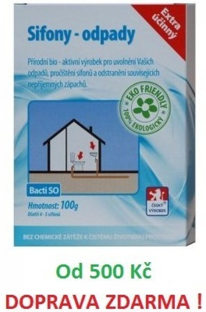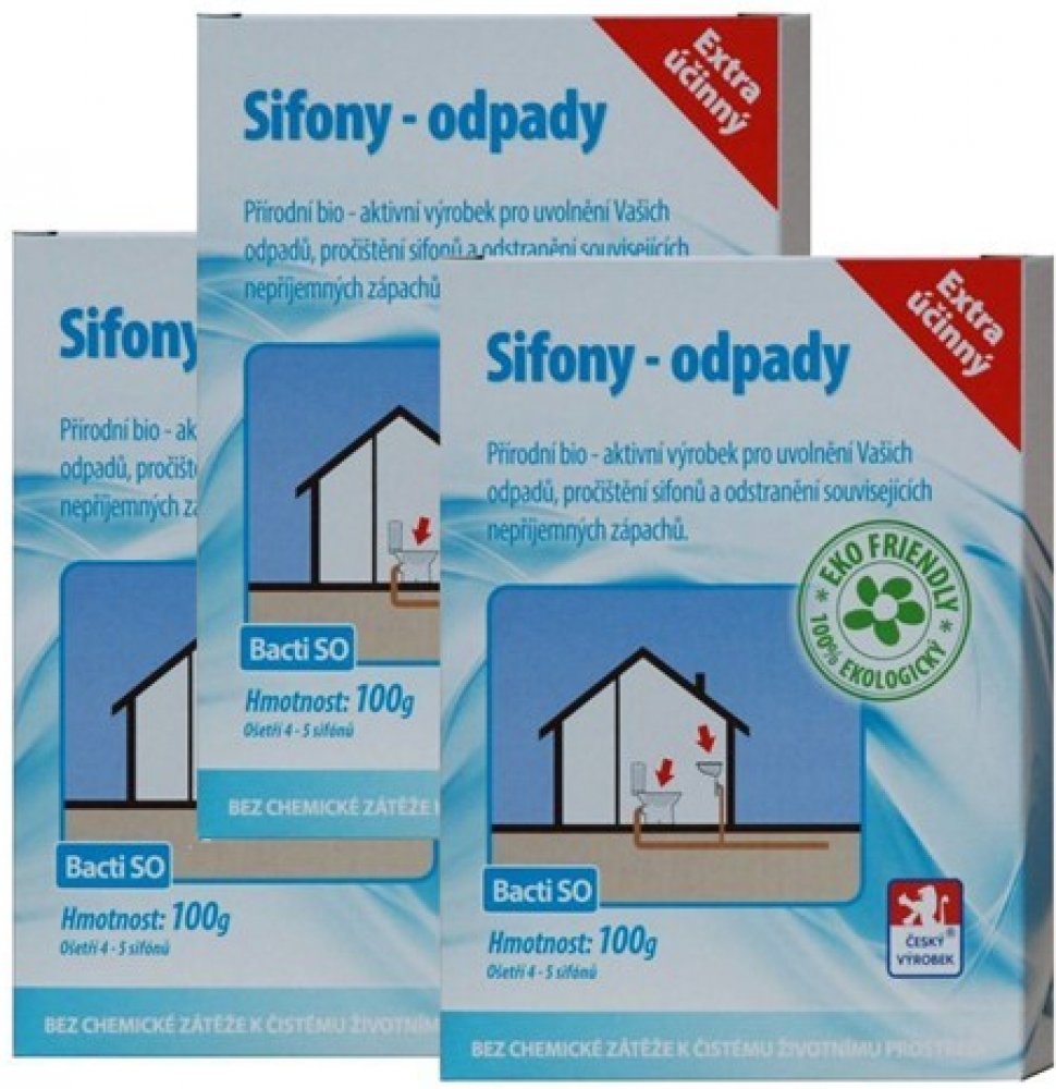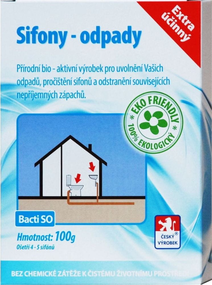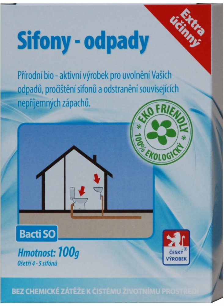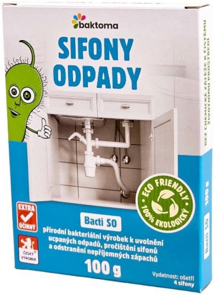 Bacti SO je zcela přírodní a ekologický vysoce účinný biologický prostředek. Je určen k uvolnění a zprůchodnění ucpaného a zaneseného odpadního potrubí a sifonu. Při jeho používání dochází k odstranění nepříjemného zápachu vycházejícího ze sifonu nebo odpadního systému. Při pravidelném používání Bacti SO je ošetřováno celé odpadní potrubí.