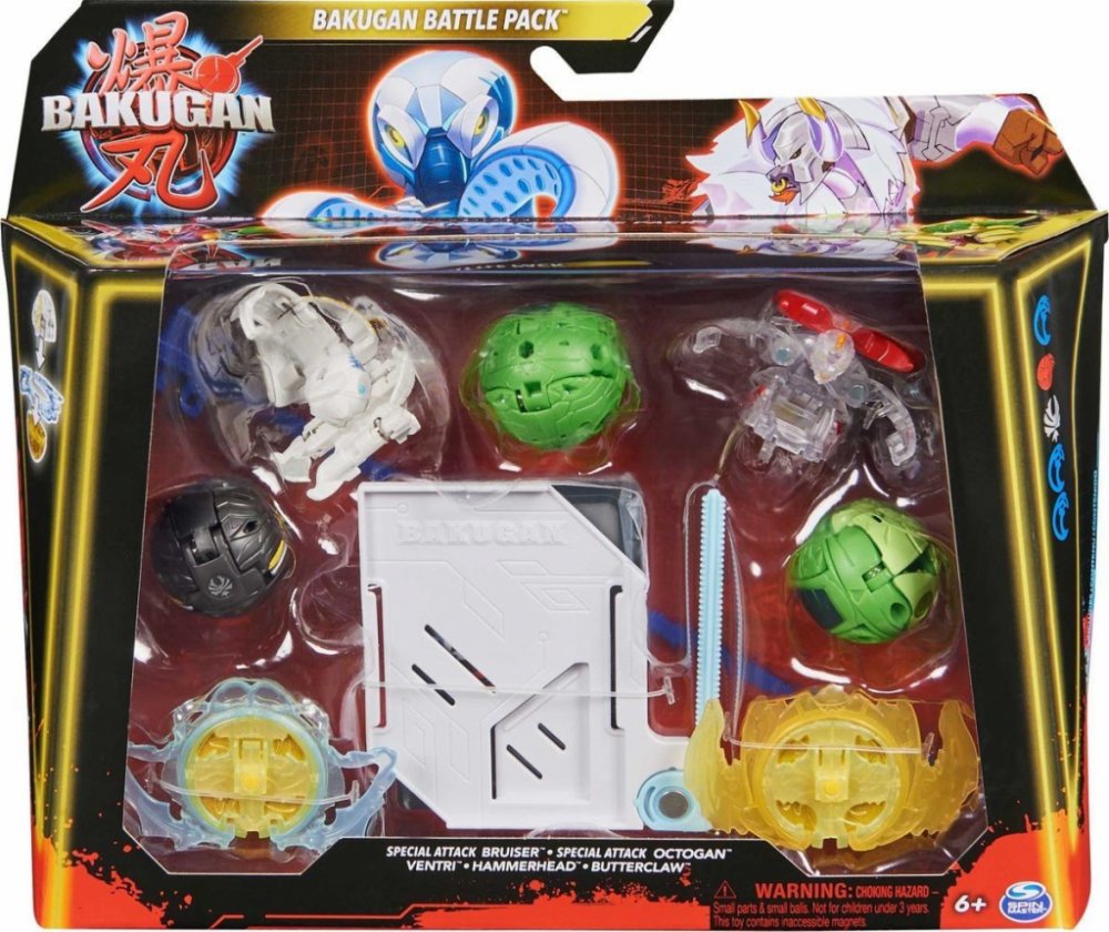5 balení speciální útok s 5 Bakugan bojovníky ze série 6. Balení obsahuje 2 Bakugany Speciální útok (rotace), 2 Kruhy, 1 tažné lanko, 3 Core Bakugan, 5 karet charakteru, 2 Gate karty, 2 karty speciální útok, 3 Brawler karty, instrukce a pravidla. Vhodné od 6 let.