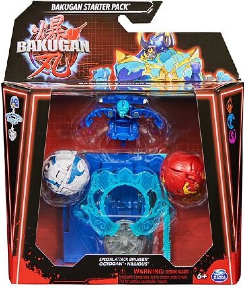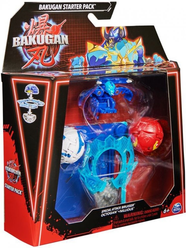 Startovací sada se 3 Bakugan bojovníky ze série 6. balení obsahuje: 1 Bakugan Speciální útok (rotace), 1 Kruh, 1 tažné lanko, 2 Core Bakugan, 3 karty charakteru, 2 Gate karty, 1 karta speciální útok, 3 Brawler karty, instrukce a pravidla.