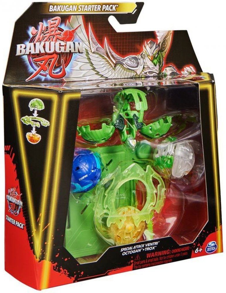 Startovací sada se 3 Bakugan bojovníky ze série 6. balení obsahuje: 1 Bakugan Speciální útok (rotace), 1 Kruh, 1 tažné lanko, 2 Core Bakugan, 3 karty charakteru, 2 Gate karty, 1 karta speciální útok, 3 Brawler karty, instrukce a pravidla.