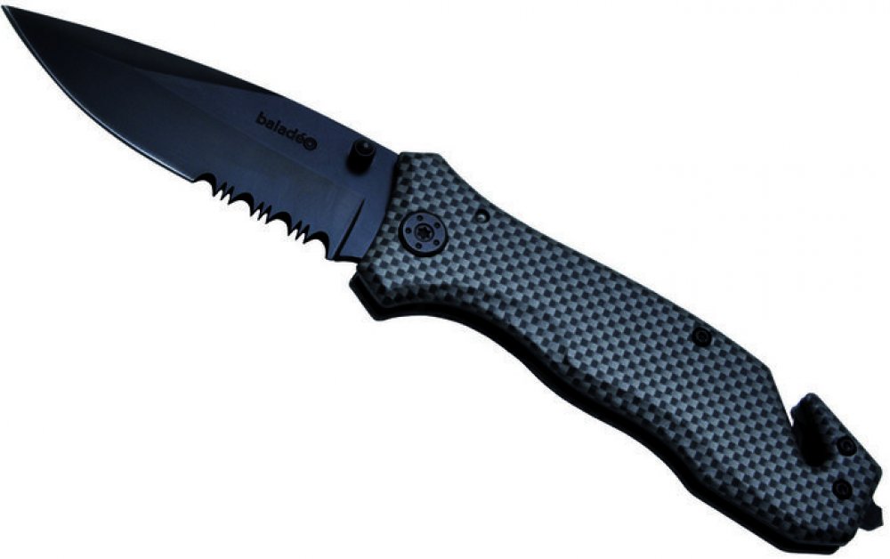 Baladéo záchranářské 90 mm 158 g 12.3 cm nerezová ocel 420 s titanovým povlakem pro každodenní použití (7–9 cm) do běžně velké kapsy automatické otevření nerezová ocel, hliník, imitace karbonového vlákna s vysokou odolností proti vlhkosti 3 s palcovým čepem s částečně pilovitým ostřím