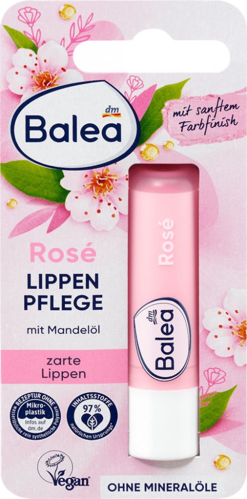 Balea balzám na rty Rosé obklopí vaše rty svou dokonalou vůní a spolu s olejem z mandlových květů poskytne výživu včetně cenné hydratace. Balzám udržuje rty vláčné, chrání je před vysoušením a popraskáním, a navíc jim zanechá jemně třpytivý efekt. Pro vyživené a hebké rty!