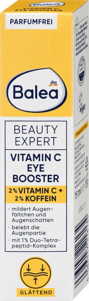 Balea Beauty Expert oční booster obsahuje 2 % vitamínu C, 2 % kofeinu a 1 % duo-tetra-peptidového komplexu. Redukuje vrásky, tmavé kruhy pod očima a revitalizuje oční okolí. Vitamín C podporuje tvorbu kolagenu, redukuje známky stárnutí pleti, má rozjasňující účinek. Kofein podporuje mikro krevní oběh v pokožce. Duo-tetra-peptidový komplex zpevňuje pleť a účinně redukuje vrásky kolem očí. V kombinaci s 5 % niacinamidu cíleně posiluje jemné oční okolí.