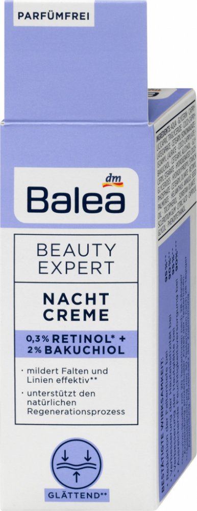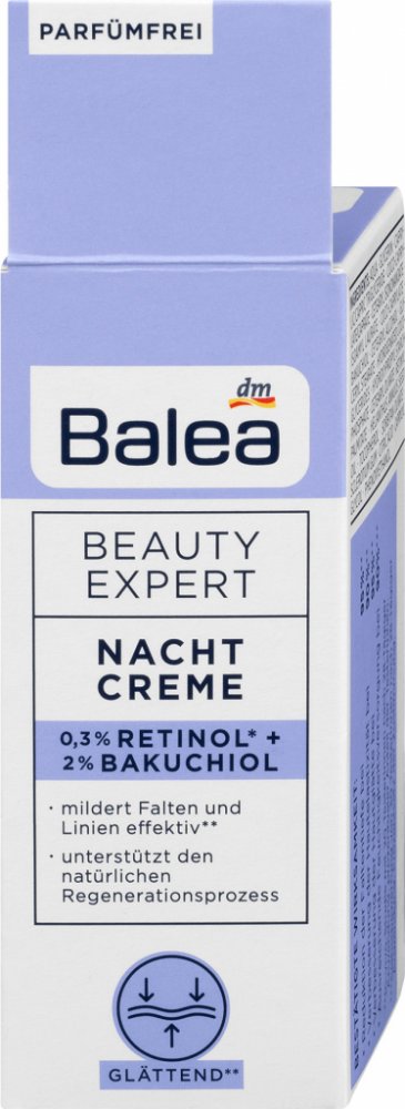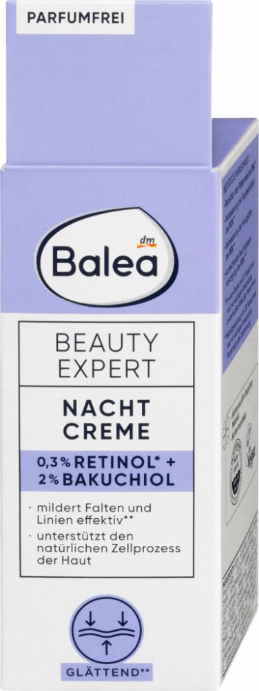 Staňte se odborníkem na krásu! Balea přichází s novou řadou Beauty Expert, která vám pomůže získat zářivou pleť. Noční krém Balea Beauty Expert s 0,3% retinolem* + 2% bakuchiolem účinně redukuje vrásky a podporuje přirozený proces regenerace pokožky. Bakuchiol je rostlinná alternativa k retinolu a společně zajišťují účinné zlepšení pokožky. Vzorec s 0,3% retinolem a 2% bakuchiolem proniká hluboko do horní vrstvy pokožky a poskytuje jí intenzivní hydrataci. Vysoce účinná kompozice snižuje hloubku vrásek, zlepšuje pružnost pokožky a podporuje její regenerační proces. Kromě toho speciální kompozice připravuje pokožku na absorpci jiných účinných látek. Balea Beauty Expert noční krém s 0,3% retinolu + 2% bakuchiolu je zcela bez parfemace.## *Použitý derivát Retinolu odpovídá 0,3 % Retinolu.