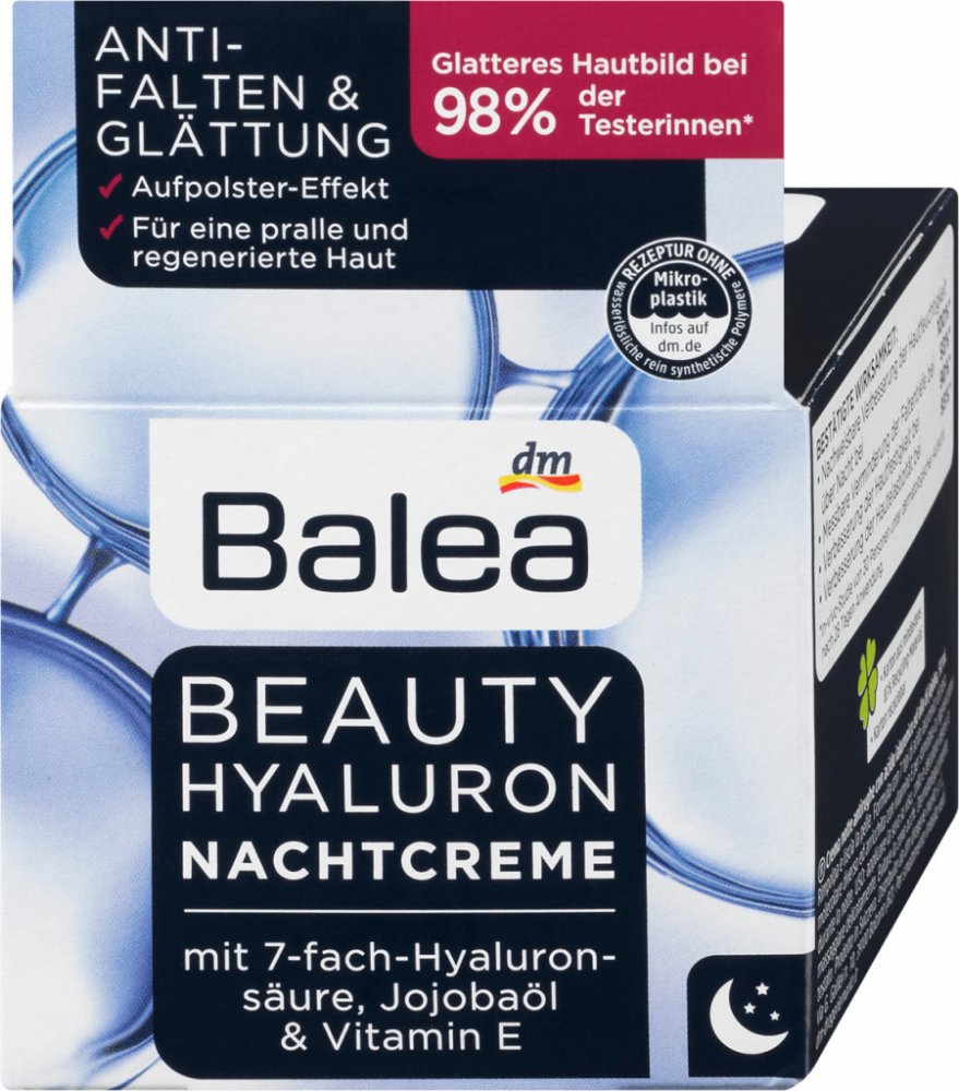 Balea Beauty Hyaluron noční krém se 7násobnou kyselinou hyaluronovou, jojobovým olejem a vitamínem E dodává pokožce intenzivní a dlouhotrvající hydrataci, účinně redukuje vrásky a vyhlazuje pleť. Aktivní složení se 7násobnou kyselinou hyaluronovou podporuje vlastní tvorbu kyseliny hyaluronové a aktivně působí zevnitř jako přirozený hydratační faktor. Pokožka vypadá plnější a hladší. Kyselina oligohyaluronová s nejmenší molekulovou hmotností působí i v hlubších vrstvách pokožky. Jojobový olej vyživuje pokožku přes noc a ráno jí dodává sametově hebký pocit. Vitamín E podporuje proces regenerace přes noc.## Receptura neobsahuje mikroplasty, ani rozpustné plně syntetické polymery.