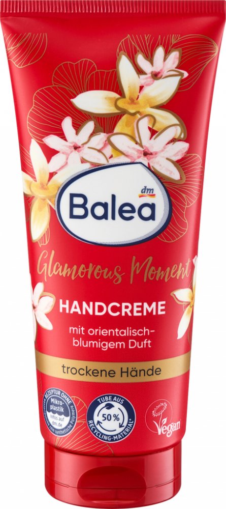 Balea krém na ruce Glamorous Moments vás bude hýčkat svou orientálně květinovou vůní. Jeho bohaté složení je ideální pro péči o suché ruce, jelikož je hloubkově hydratuje a zjemňuje. Krém obsahuje výživné složky jako je glycerin a mandlový olej, které obnovují pružnost pokožky. Dopřejte si luxus a pečujte o své ruce s krémem na ruce Balea Glamorous Moments!