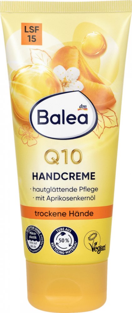 Balea krém na ruce Q10 s olejem z meruňkových jader zajišťuje pokožce rukou viditelné projasnění a cennou péči. Intenzivní péče dopřává zároveň ochranu před UVA a UVB zářením. Pečujte o suchou pokožku rukou s veganským krémem bez obsahu mikroplastů!
