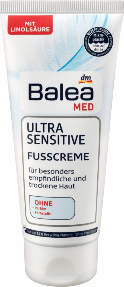 Balea MED Ultra Sensitive krém na nohy je vhodný pro obzvláště citlivou a suchou pokožku. S obsahem kyseliny linolové zmírňuje svědění suché pokožky náchylné k neurodermatitidě a podporuje její regeneraci. Kombinace rostlinných olejů bohatých na kyselinu linolovou zanechá nohy příjemně jemné. Glycerin a panthenol zachovávají přirozenou hydratační rovnováhu pokožky. Alantoin poskytuje namáhané a podrážděné pokožce uvolnění. Bez vonných a barvících látek.## Receptura neobsahuje mikroplasty, ani rozpustné plně syntetické polymery.
